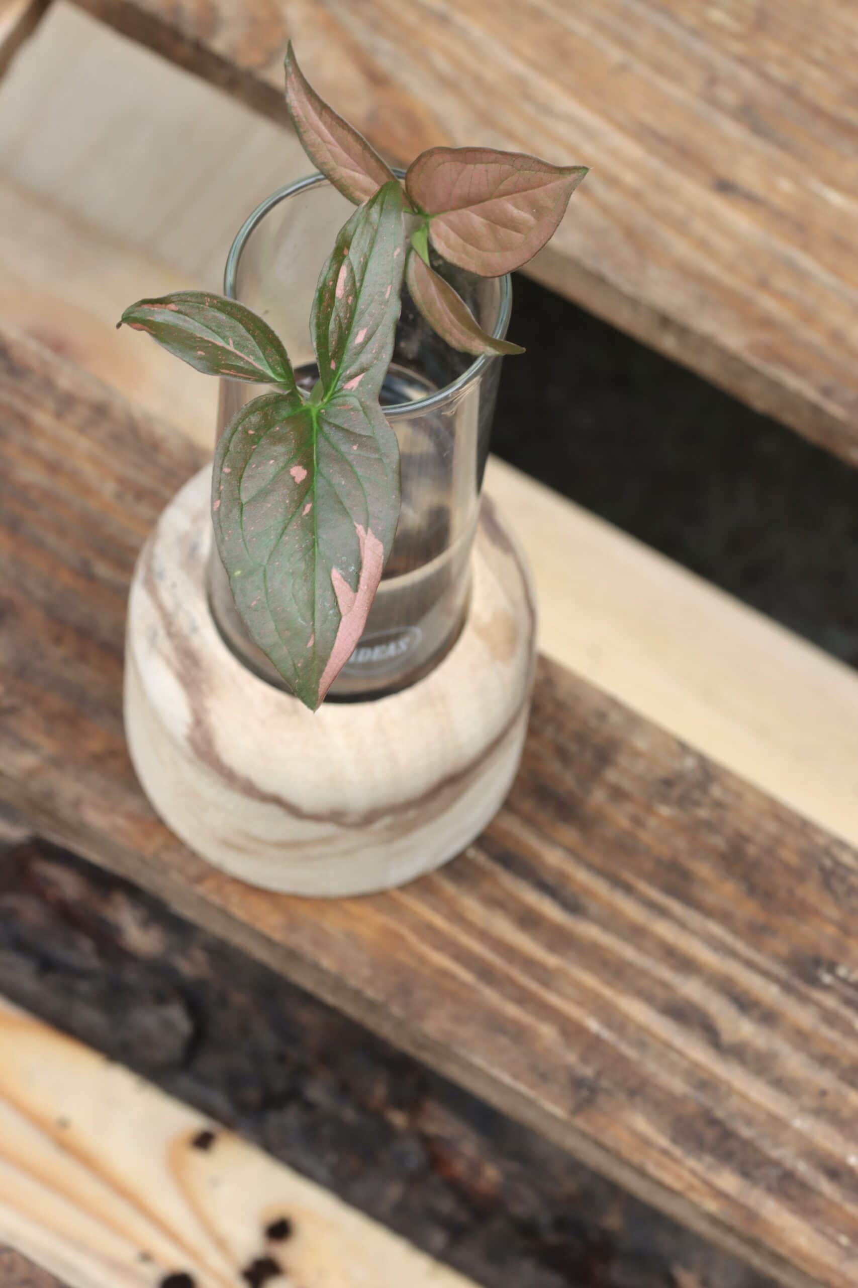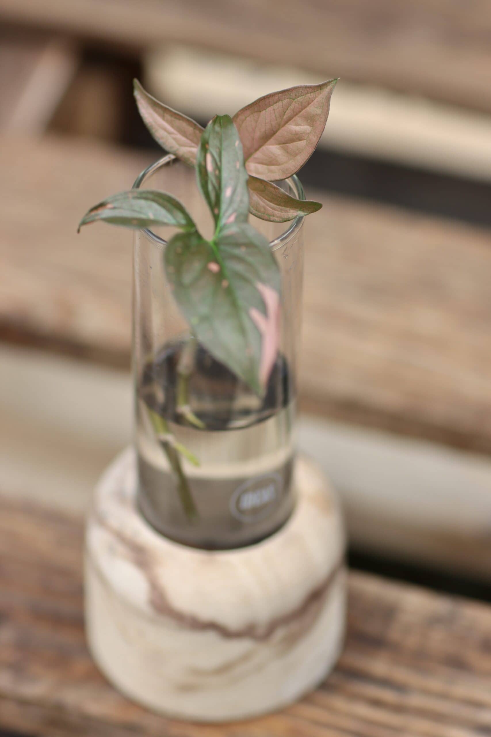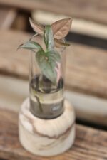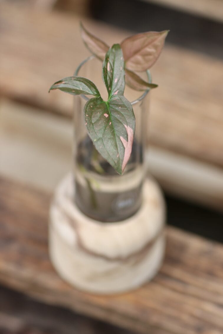 Sadzonka Syngonium Pink Splash – kolekcjonerskiego syngonium muśniętego różem! Sadzonkę polecamy ukorzenić w wodzie z dodatkiem węgla aktywowanego lub w wilgotnym sphagnum. O pielęgnacji już ukorzenionego Syngonium Pink Splash przeczytasz tutaj.