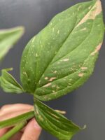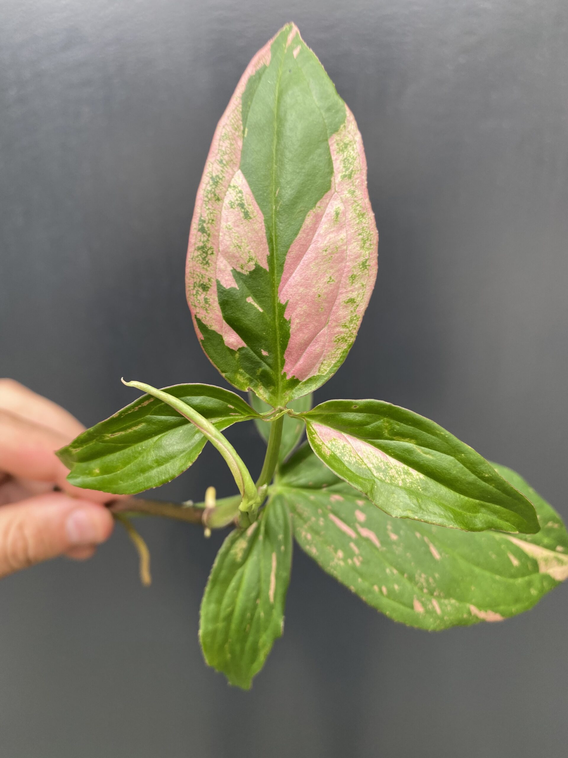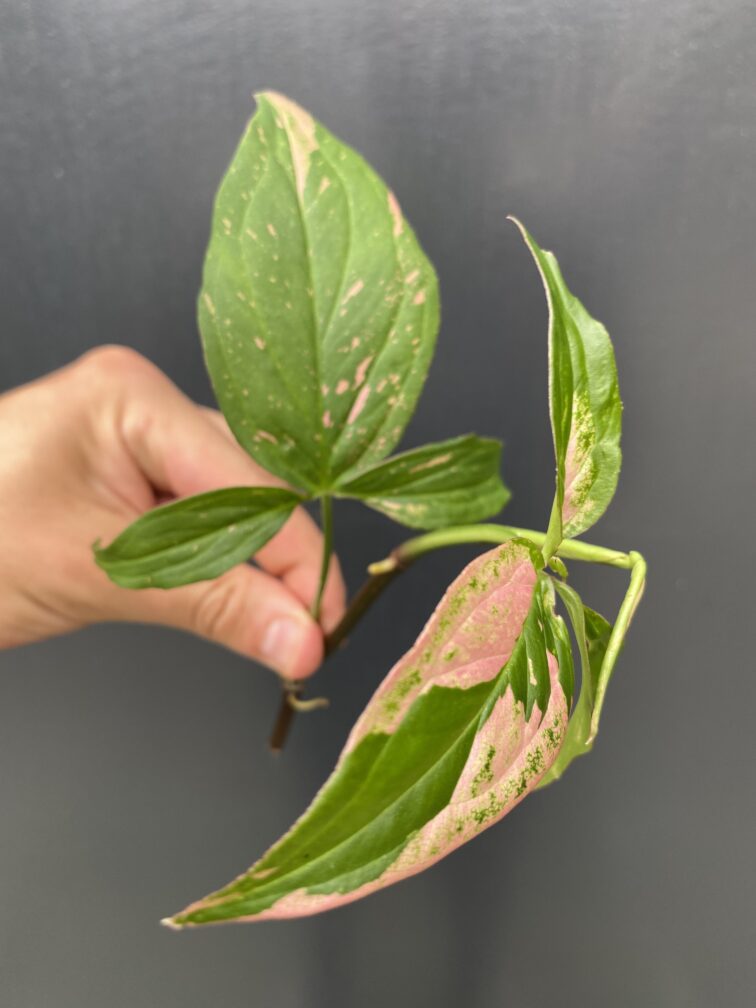 Sadzonka Syngonium Pink Splash – kolekcjonerskiego syngonium muśniętego różem! Sadzonkę polecamy ukorzenić w wodzie z dodatkiem węgla aktywowanego lub w wilgotnym sphagnum. O pielęgnacji już ukorzenionego Syngonium Pink Splash przeczytasz tutaj.