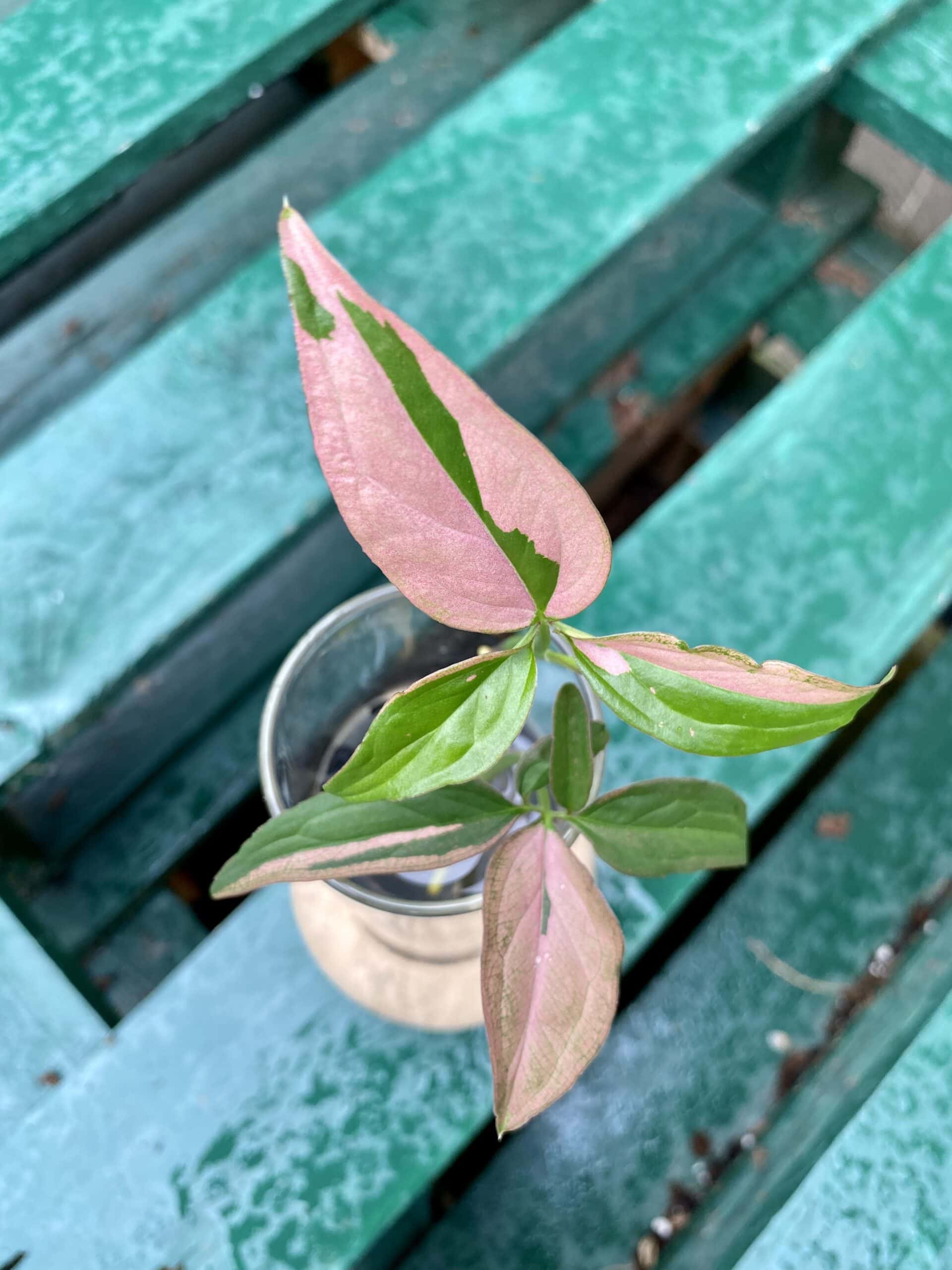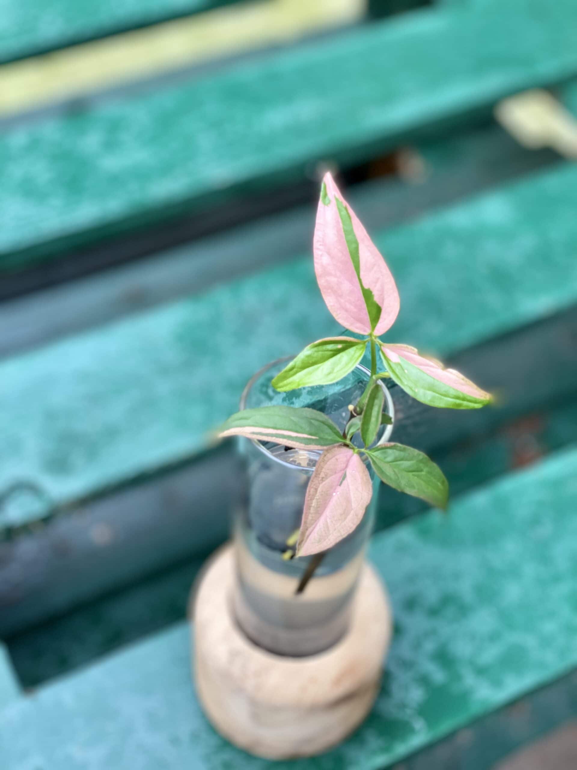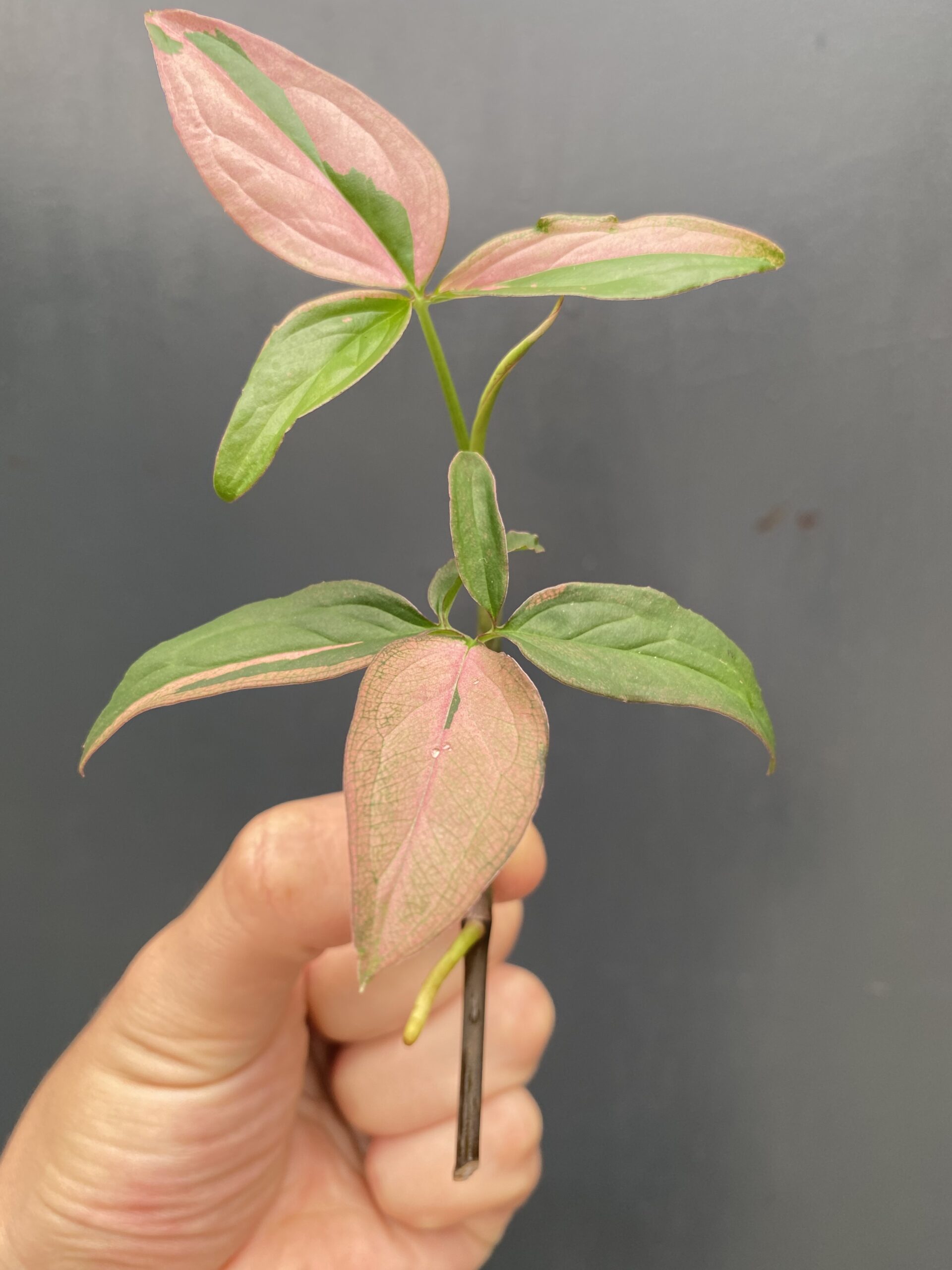 Sadzonka Syngonium Pink Splash – kolekcjonerskiego syngonium muśniętego różem! Sadzonkę polecamy ukorzenić w wodzie z dodatkiem węgla aktywowanego lub w wilgotnym sphagnum. O pielęgnacji już ukorzenionego Syngonium Pink Splash przeczytasz tutaj.
