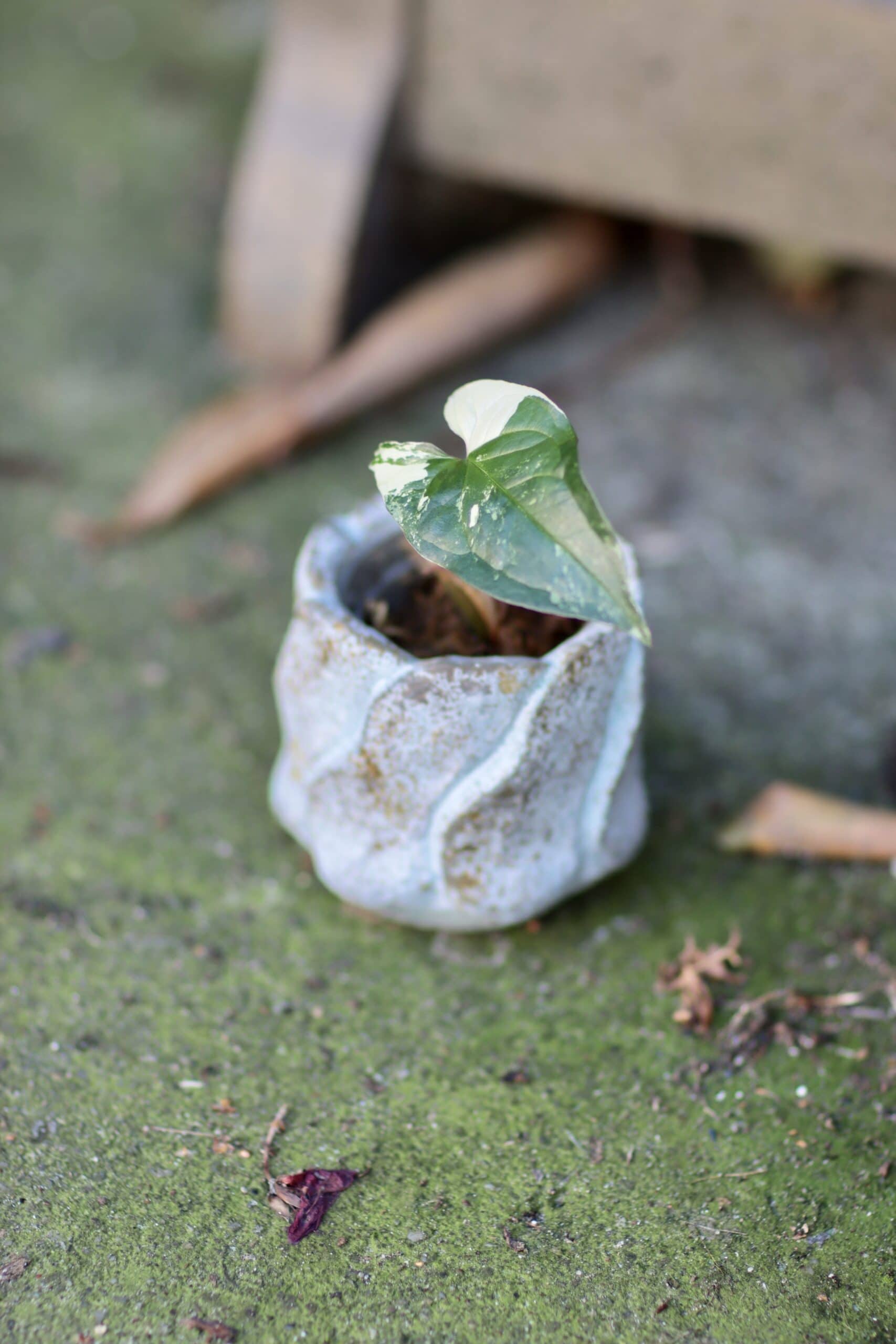 Widoczna na zdjęciu roślina: Sadzonka Syngonium Podophyllum Albo Variegata ma wysokość około 8 cm. Jej doniczka ma 5 cm średnicy oraz 5 cm wysokości.
