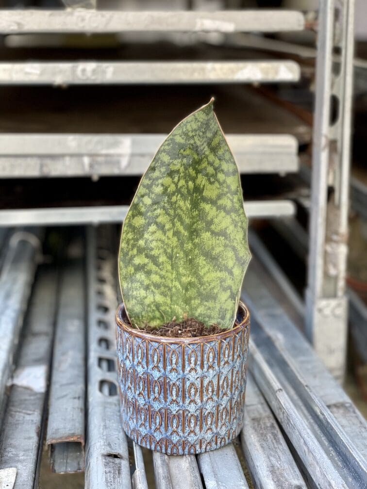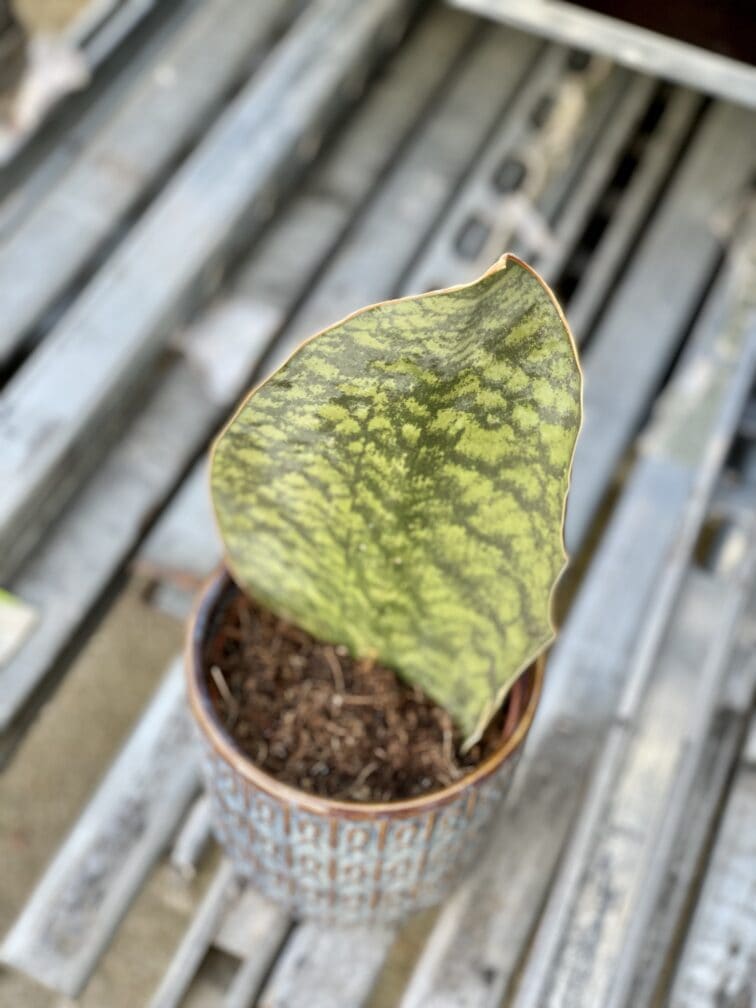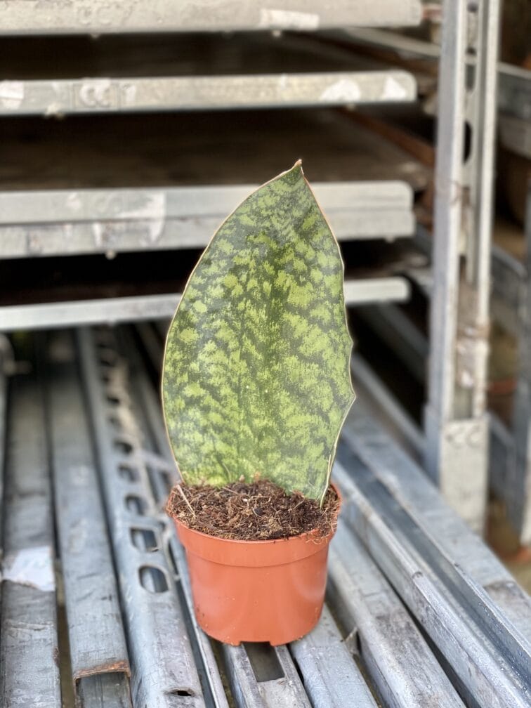 Sansevieria Masoniana to dość rzadko spotykana odmiana Sansevierii o wyjątkowo szerokich, mięsistych liściach z ciekawym, egzotycznym wzorem i brązowozłotą obwódką. Tak jak jej kuzynki rośnie wolno, jest bardzo wytrzymała i ma wyjątkowe uzdolnienia w zakresie oczyszczania powietrza w naszych mieszkaniach.