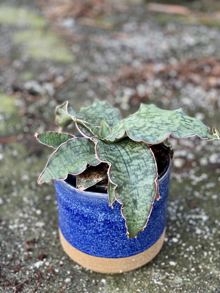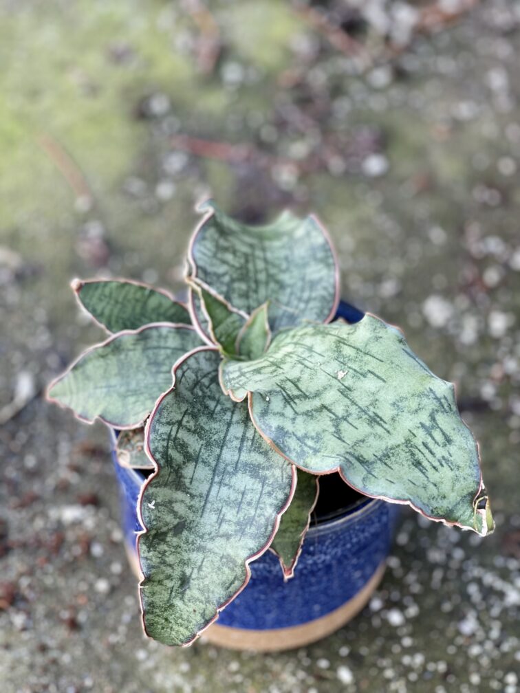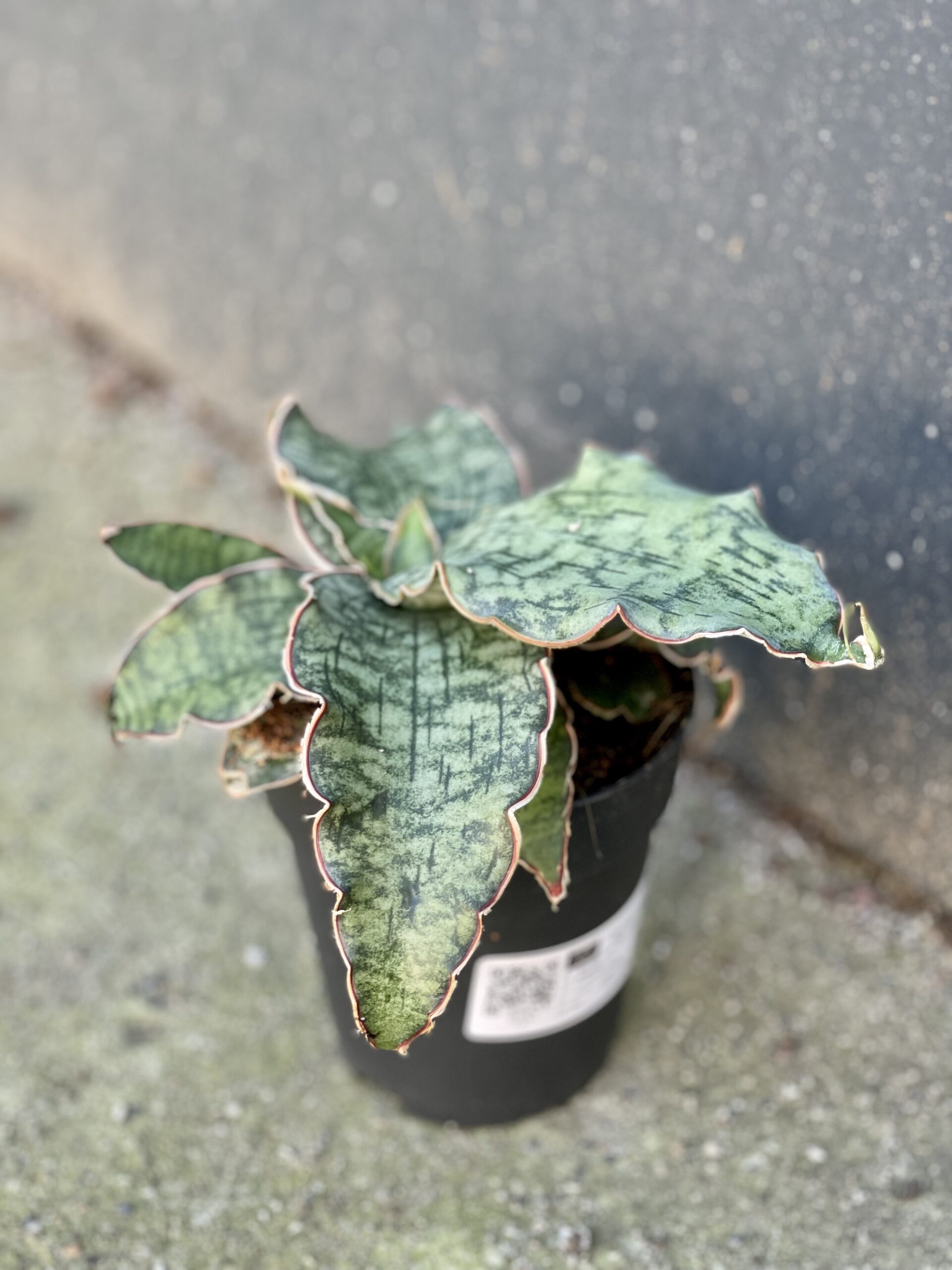 Sansevieria Star Green Granite to urokliwa sansewieria o wyrazistych, bordowych marginesach liści, które dodatkowo wyróżnia falisty, nieregularny kształt i dekoracyjny, cętkowany wzór na blaszce liściowej.