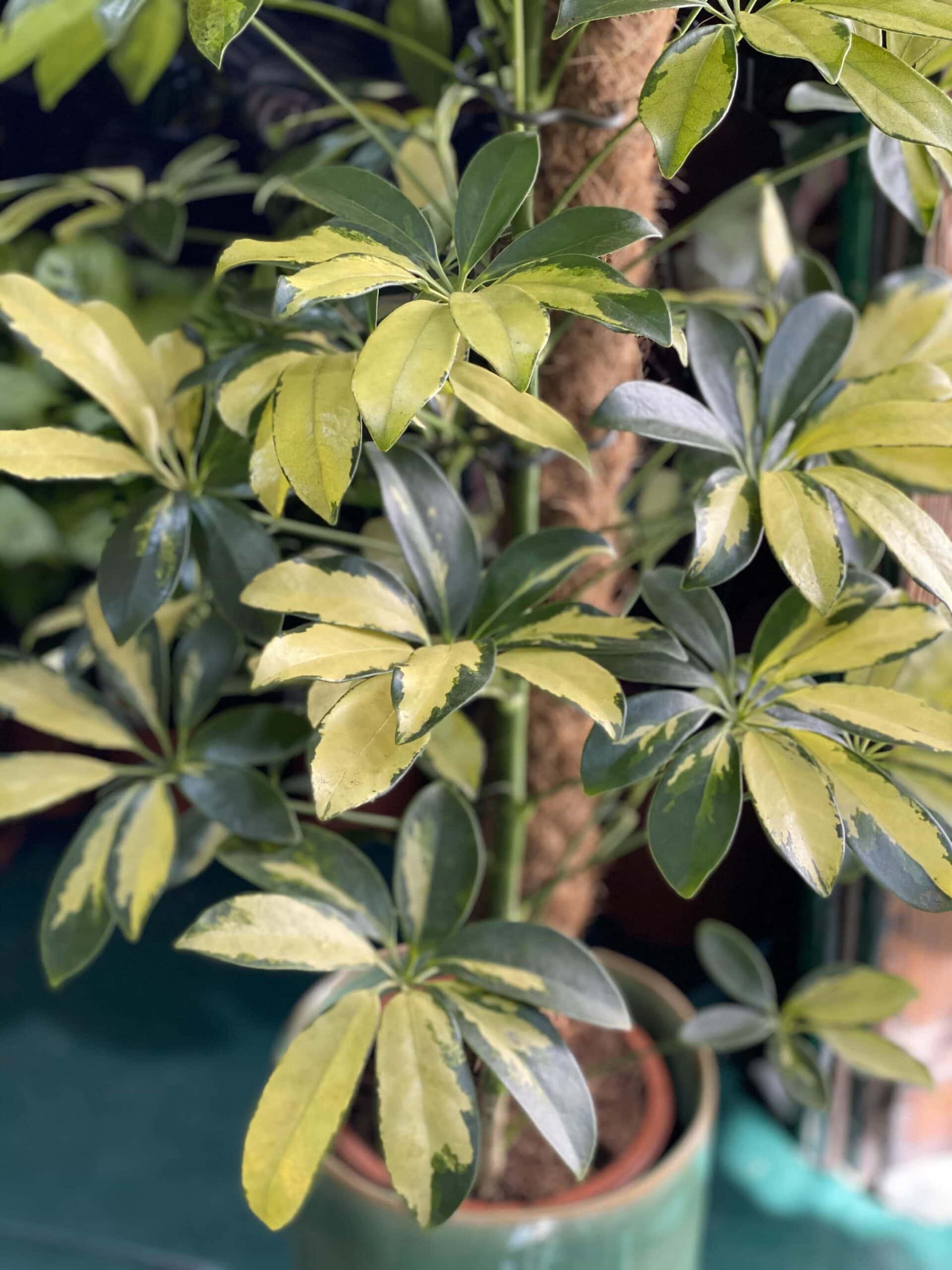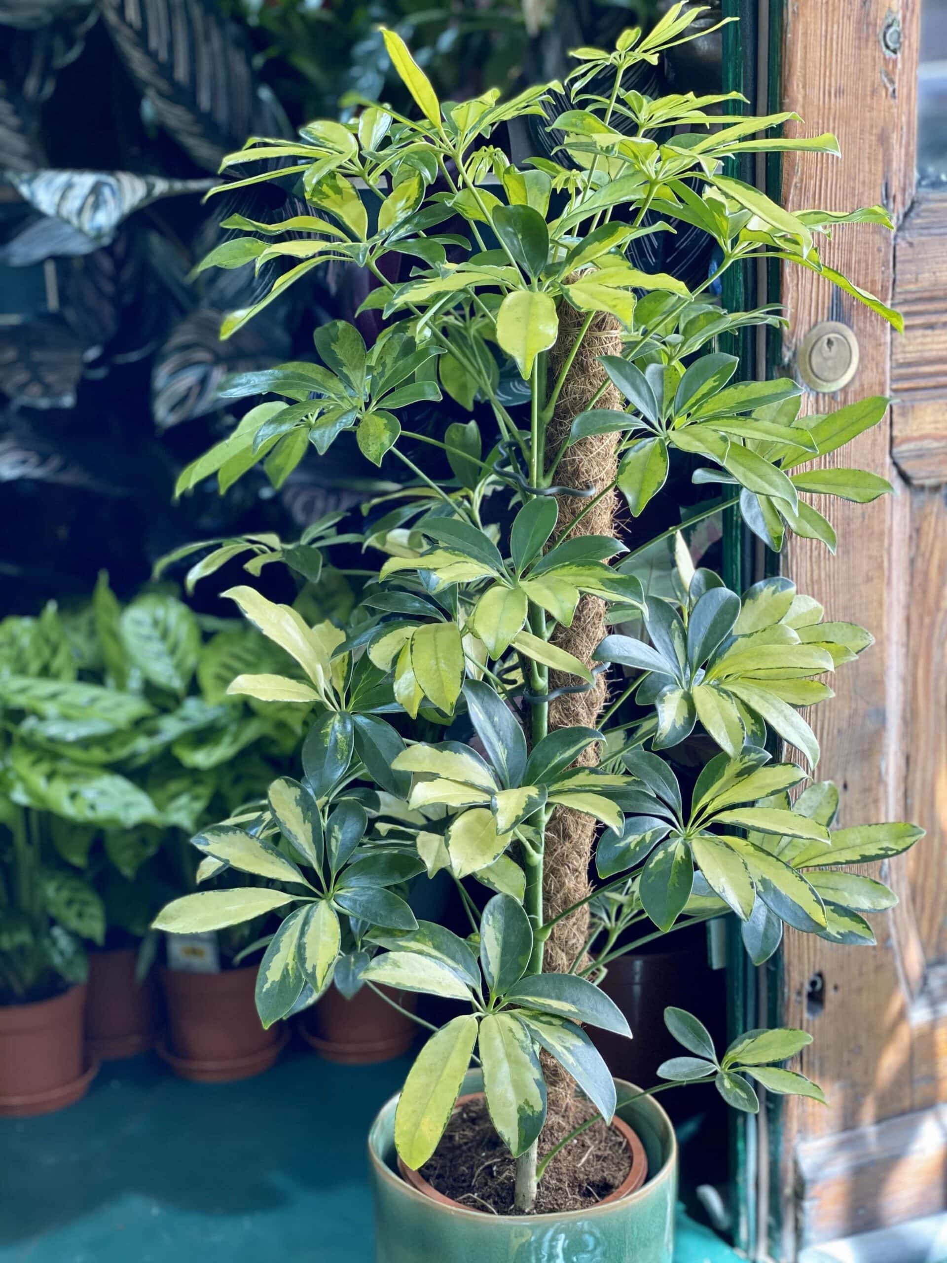 Schefflery to bardzo dekoracyjne rośliny; wszystkie mają piękne, dłoniaste liście i strzeliste sylwetki. Odmiana Trinette zachwyca też radosnym połączeniem dwóch kolorów. Dostępne u nas drzewko to duży, rozłożysty okaz wparty na uroczym paliku kokosowym.