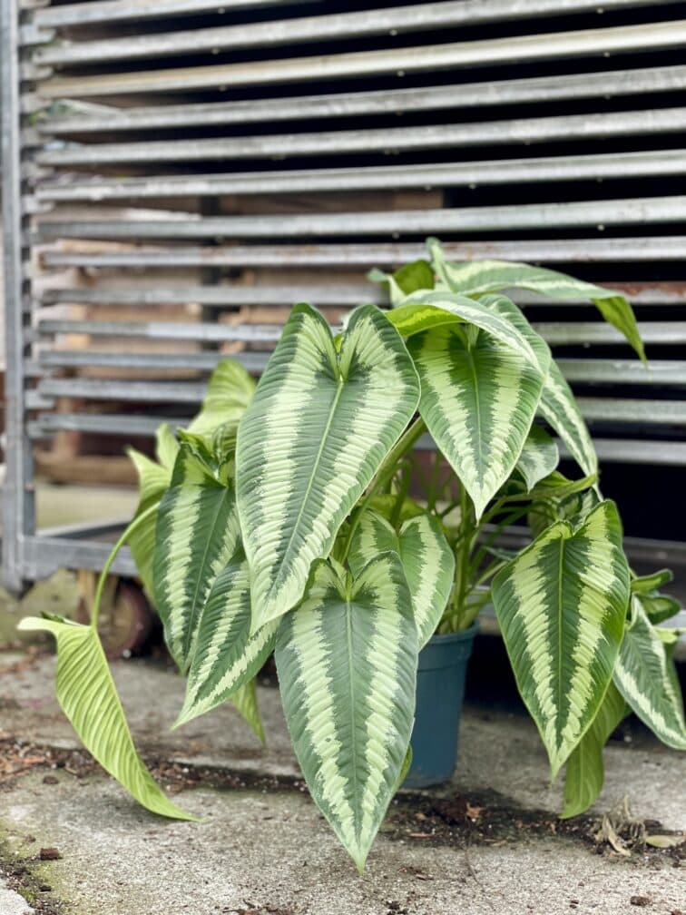 Widoczna na zdjęciu roślina: Schismatoglottis Wallichii ma wysokość około 75 cm. Jej doniczka ma 19 cm średnicy oraz 17 cm wysokości.