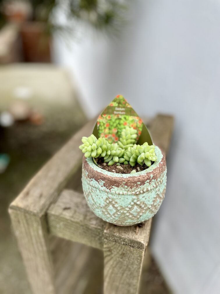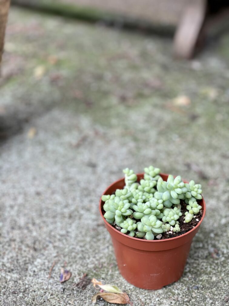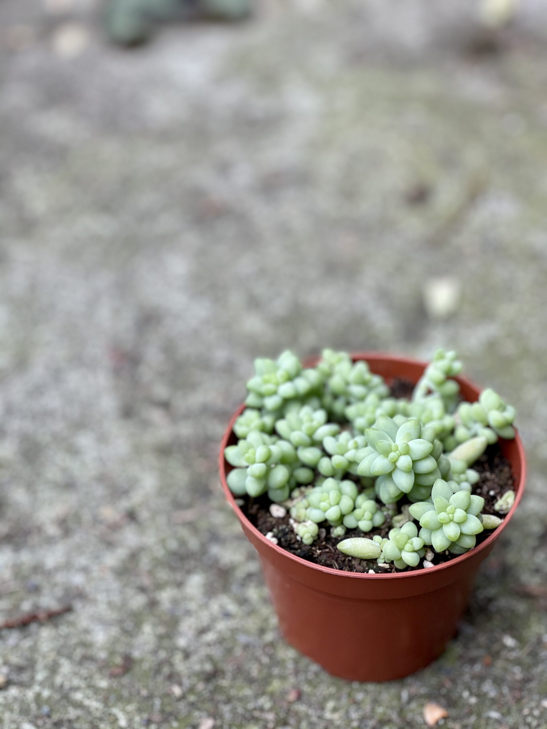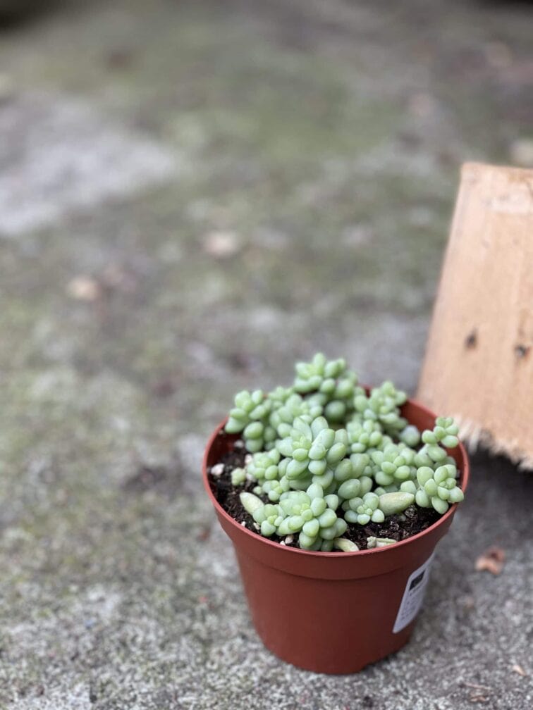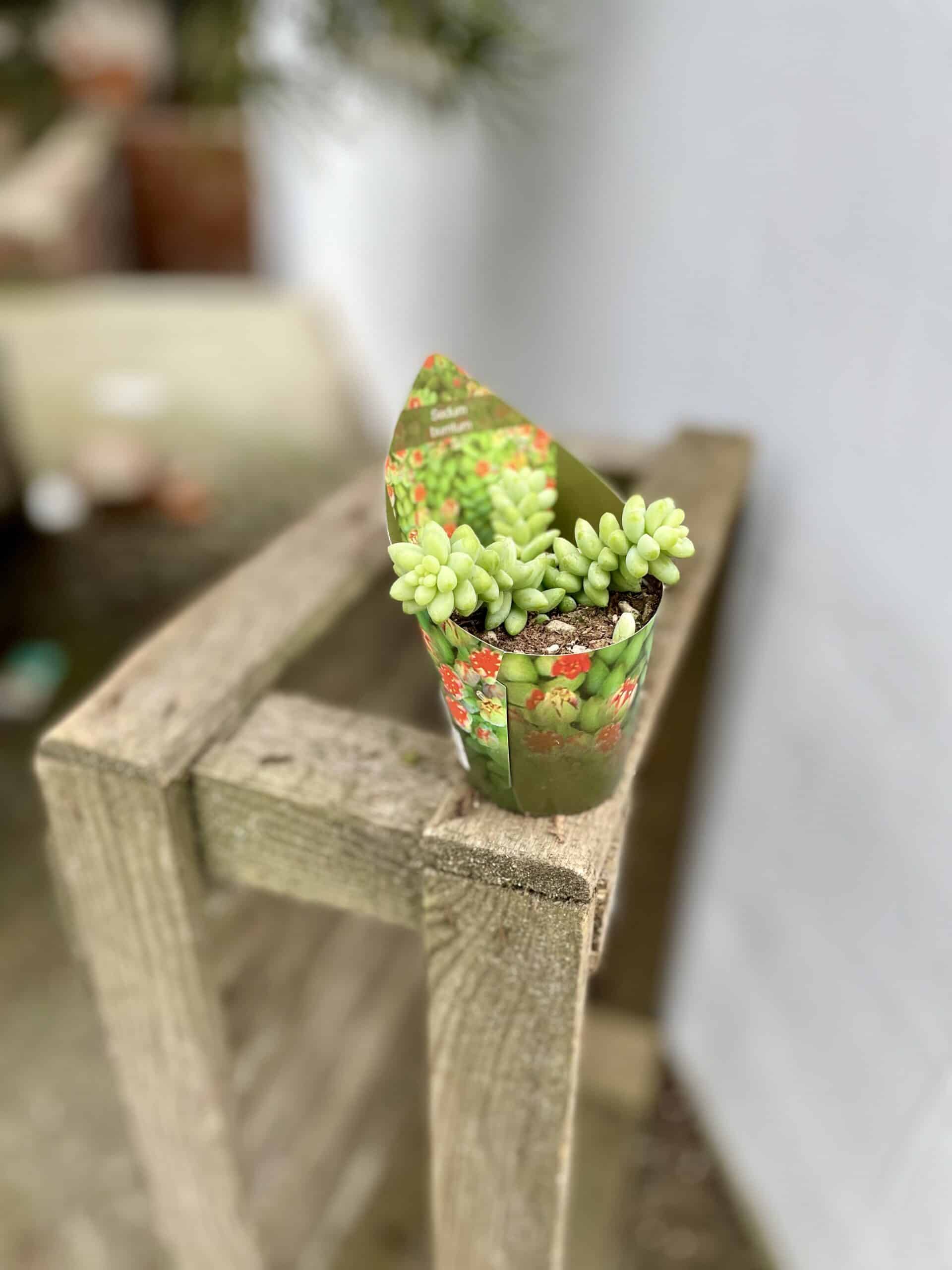 Sedum burrito, inaczej rozchodnik walcowaty, to olśniewająco piękny sukulent. Przy tym bardzo odporny na zaniedbania oraz bezpieczny dla psa i kota. Duże ilości słońca i skąpe dawki wody wystarczą, żeby móc cieszyć się kaskadami mięsistych liści. Ta roślina będzie się pięknie prezentować również w wiszącej doniczce lub makramie.