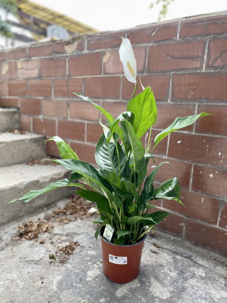 Widoczna na zdjęciu roślina: Spathiphyllum Bingo Cupido ma wysokość około 60 cm. Jej doniczka ma 17 cm średnicy oraz 15 cm wysokości.
