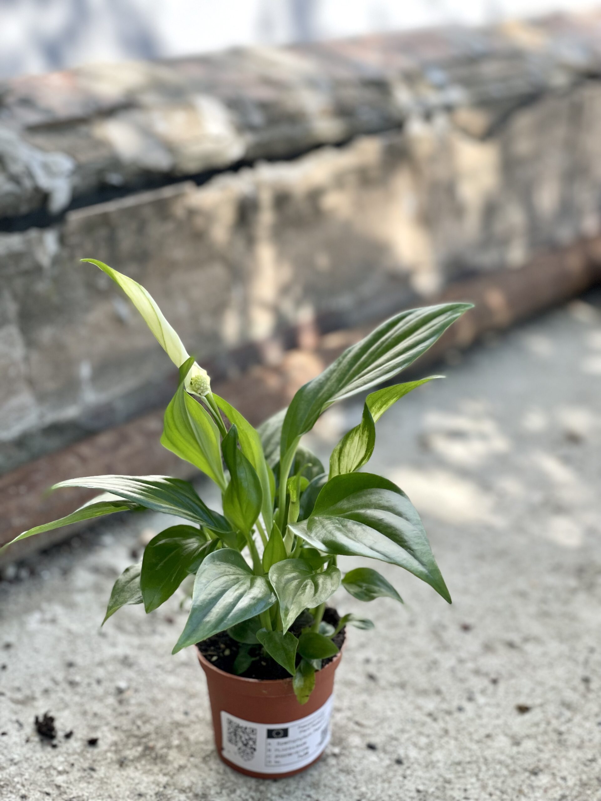 Widoczna na zdjęciu roślina: Spathiphyllum Pearl Cupido ma wysokość około 20 cm. Jej doniczka ma 7 cm średnicy oraz 6 cm wysokości.
