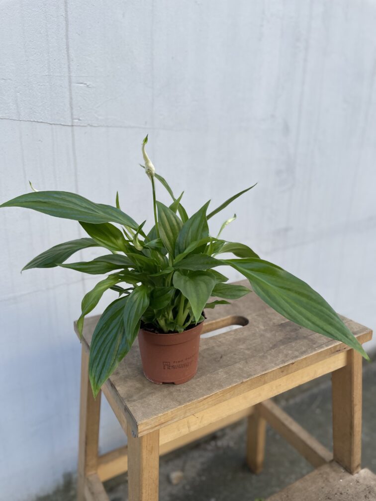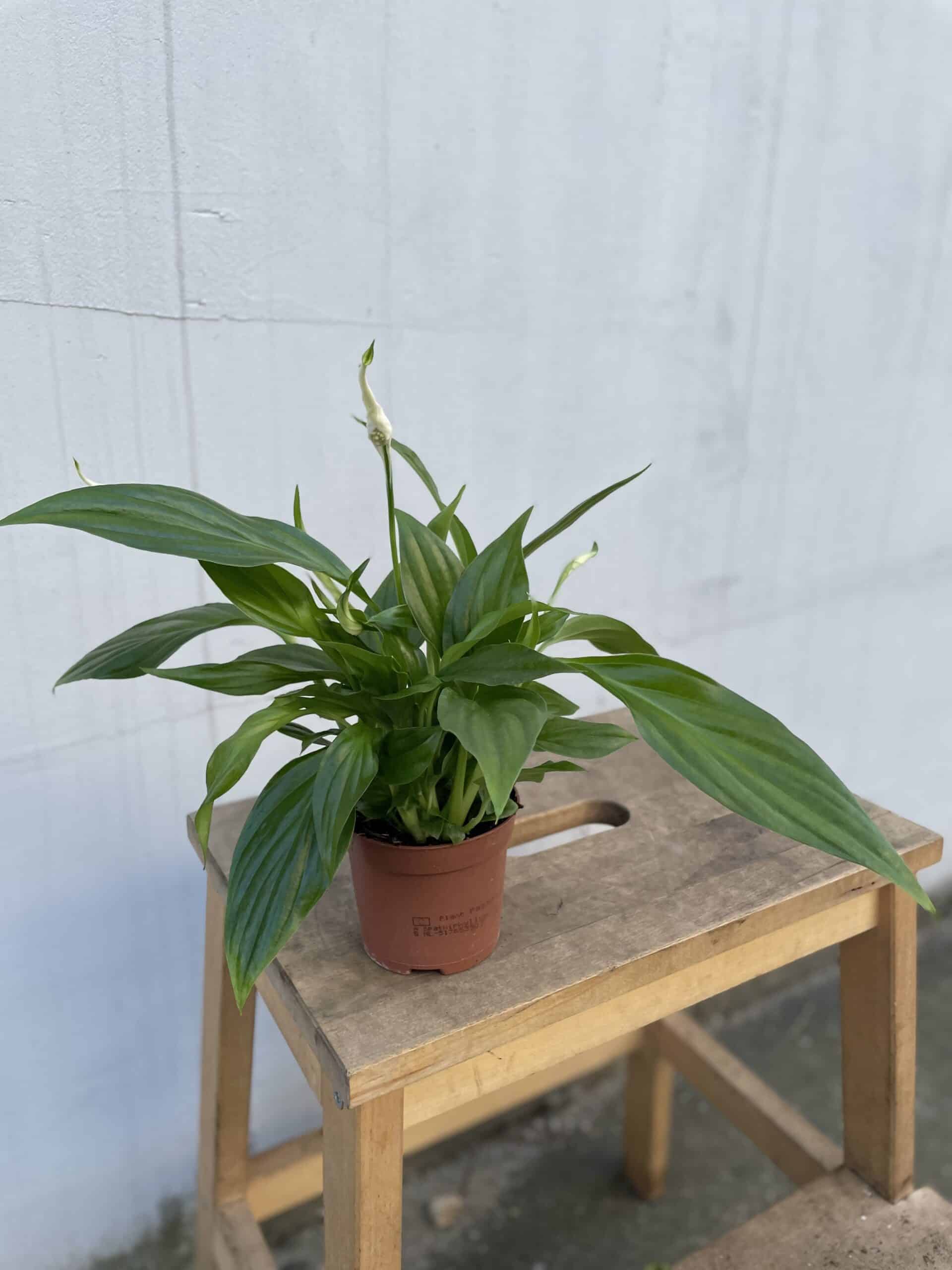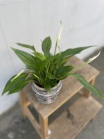 Widoczna na zdjęciu roślina: Spathiphyllum Pearl Cupido ma wysokość około 25 cm. Jej doniczka ma 9 cm średnicy oraz 7 cm wysokości.