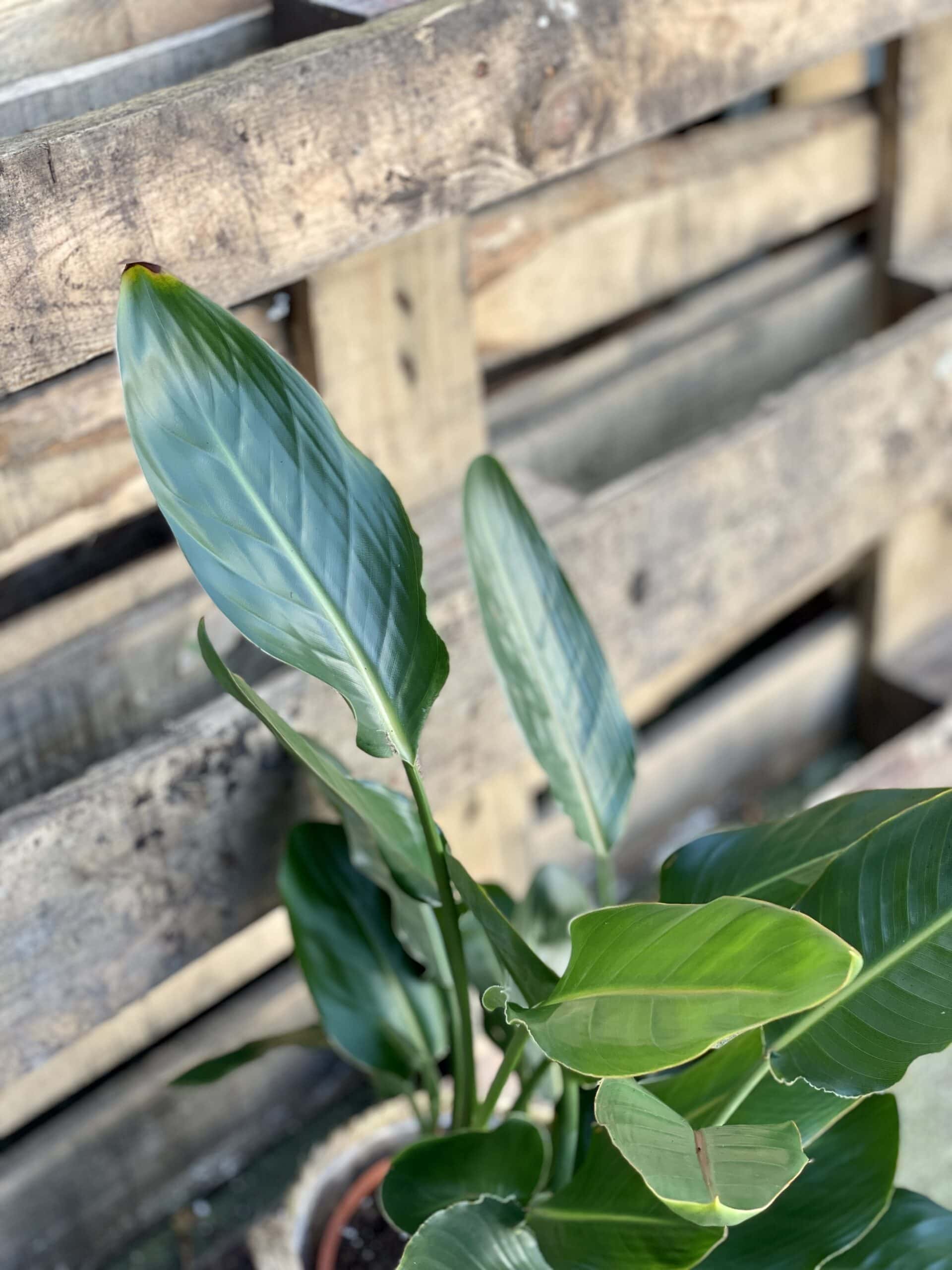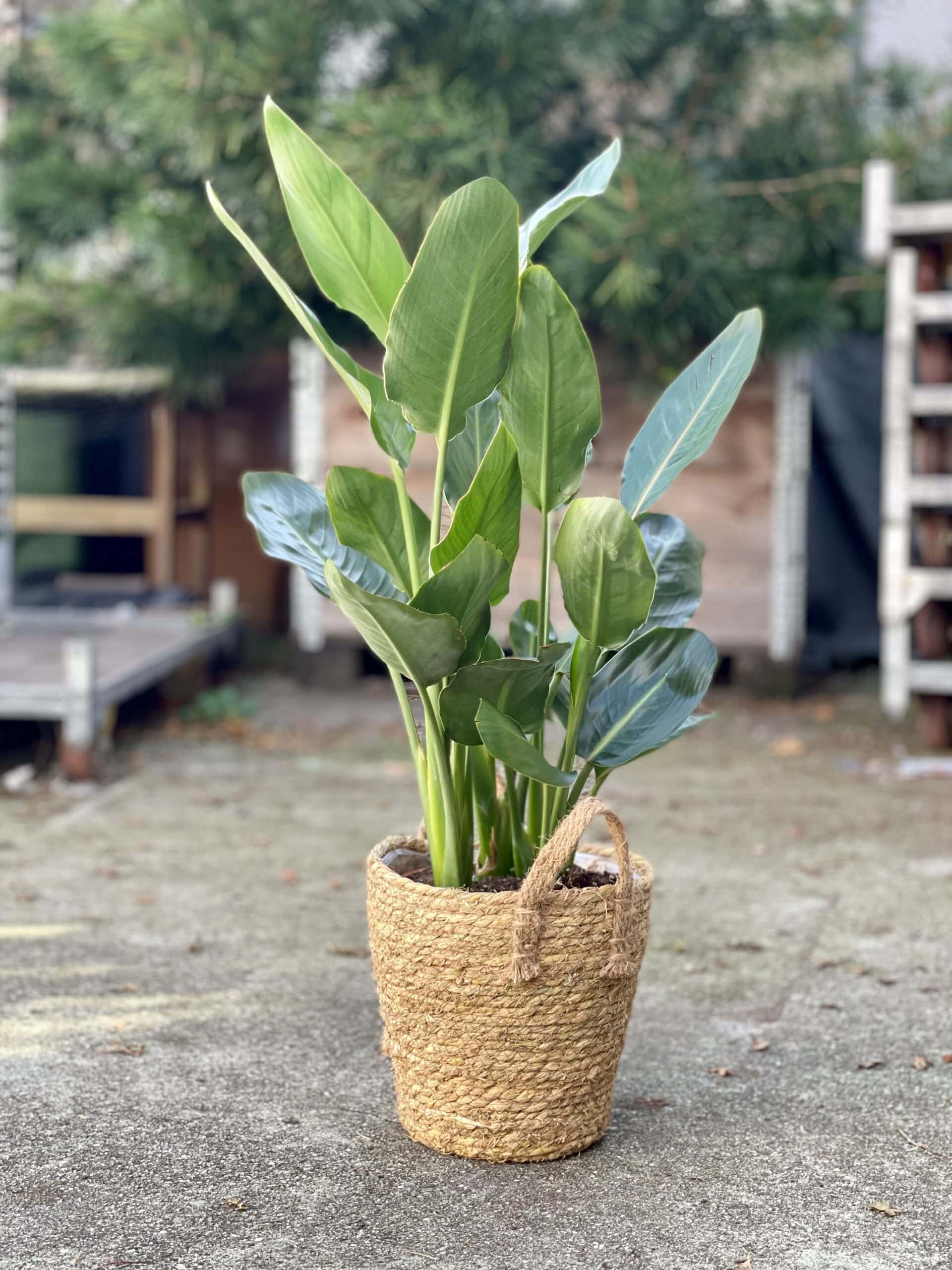 Widoczna na zdjęciu roślina: Strelitzia Reginae ma wysokość około 60 cm. Jej doniczka ma 19 cm średnicy oraz 18 cm wysokości.