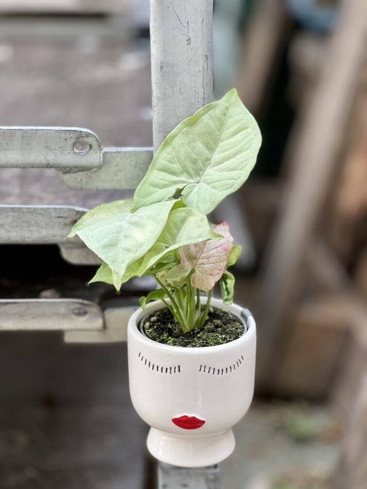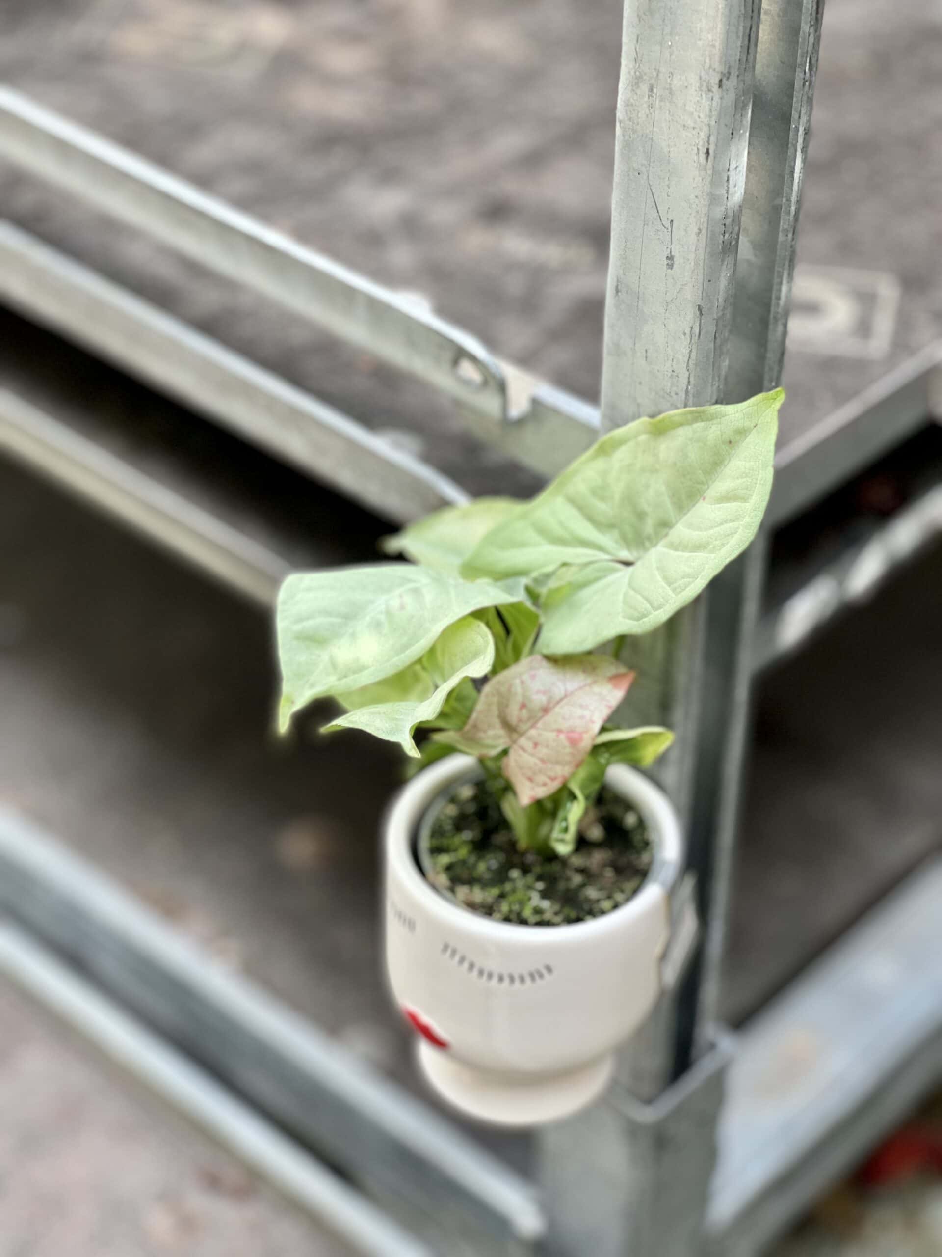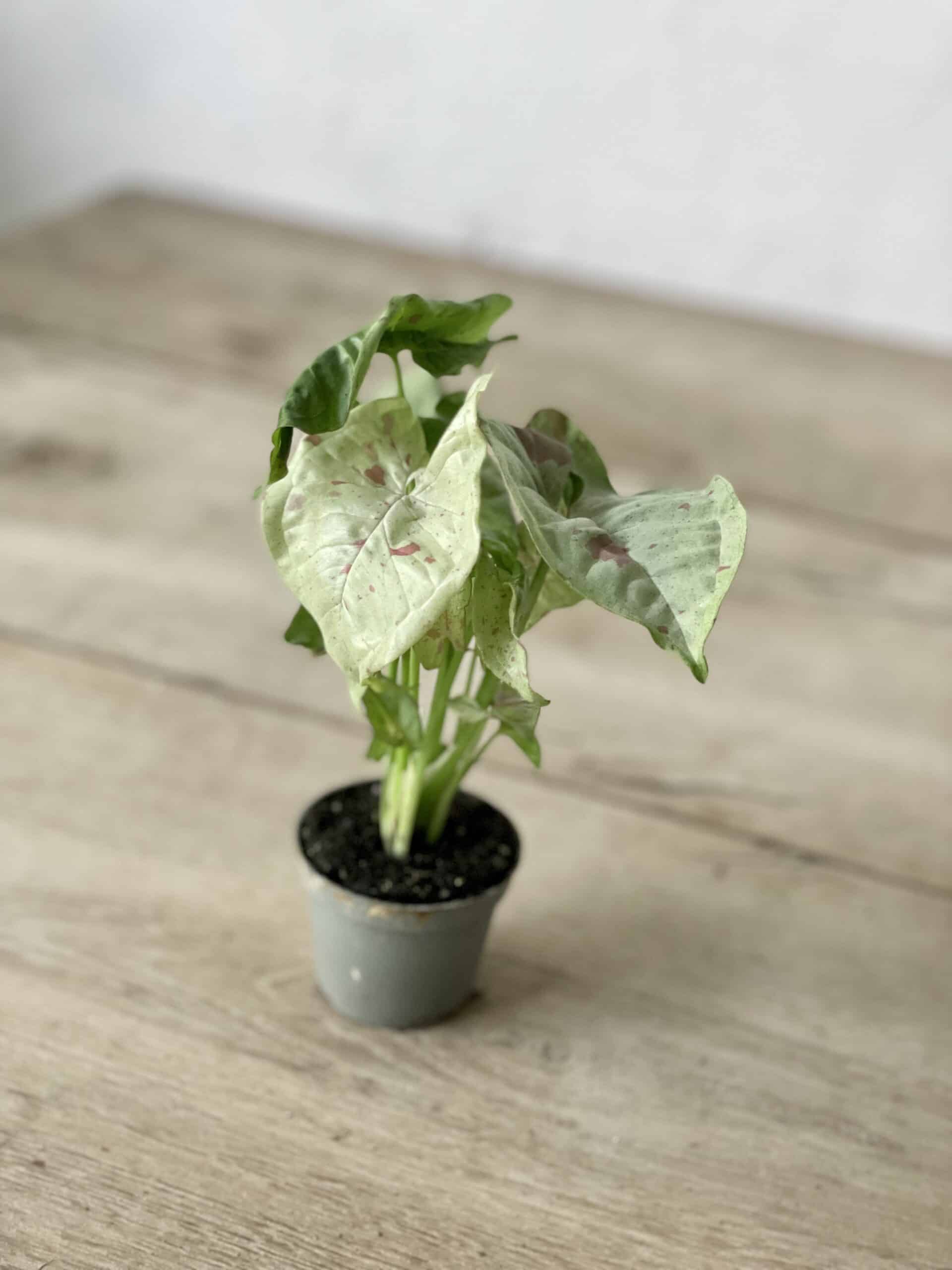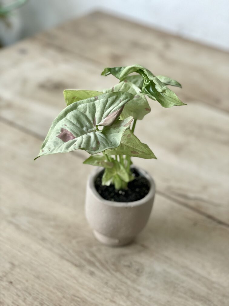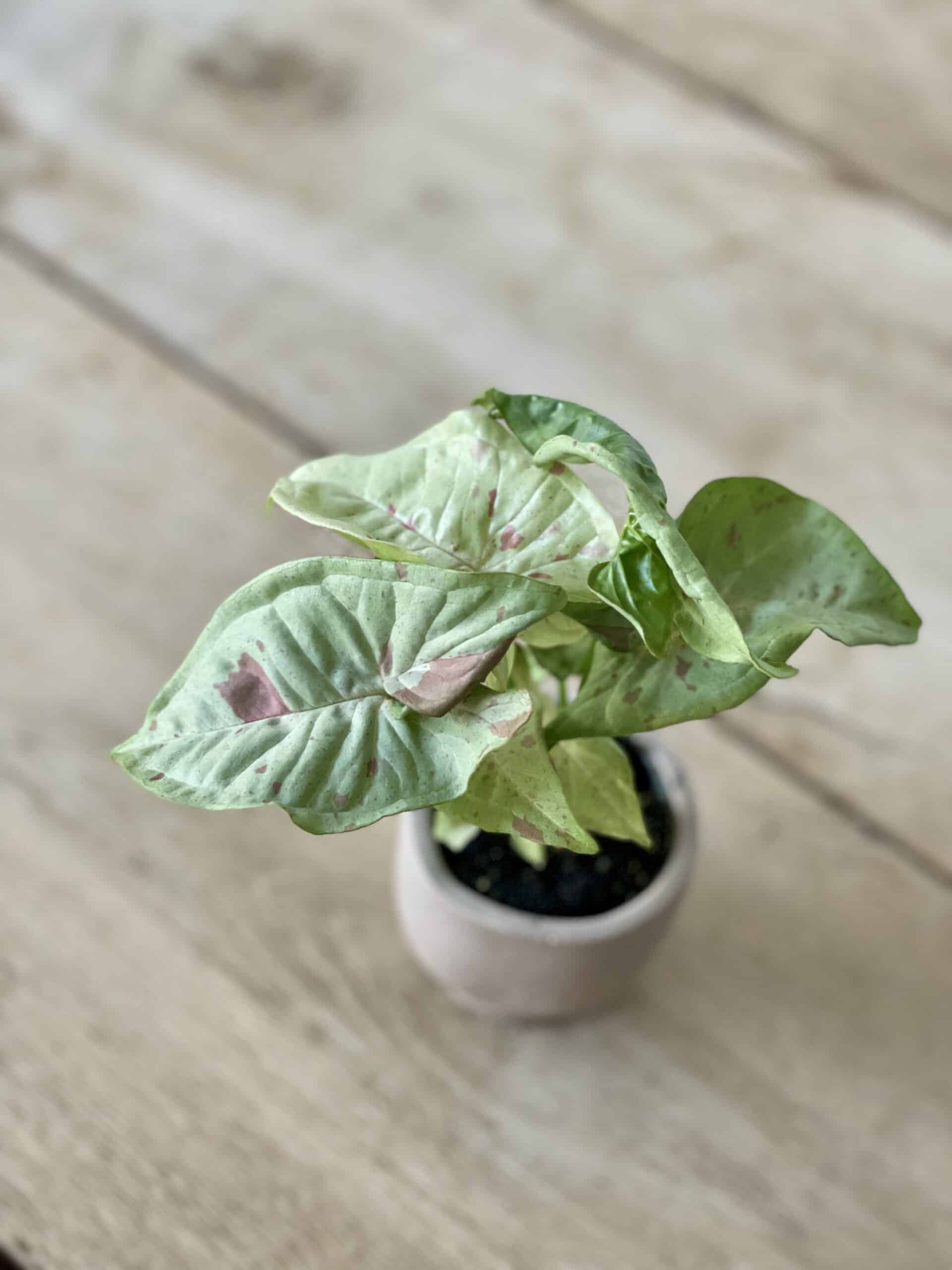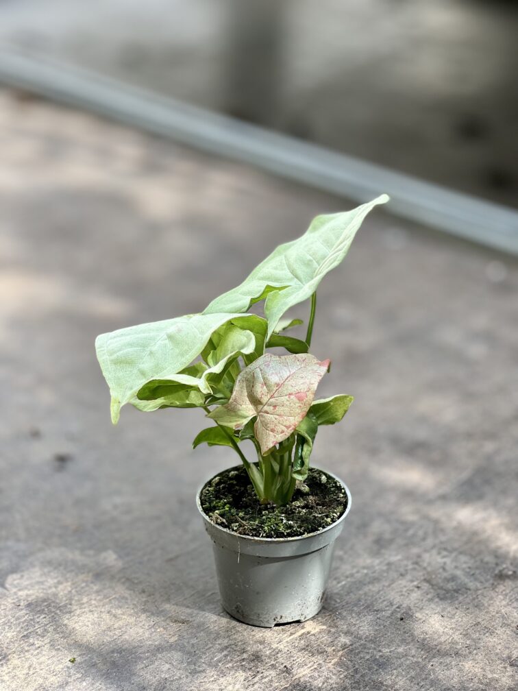 Syngonia mogą zaskoczyć mnogością barw i kształtów liści. Odmiana Milk Confetti to prawdziwa gratka dla kolekcjonerów. Jak nazwa wskazuje – ma jasne, mleczne liście i różowe piegi, wyglądające jakby liście były obsypane różowym konfetti.