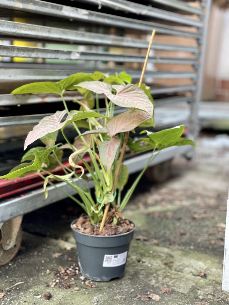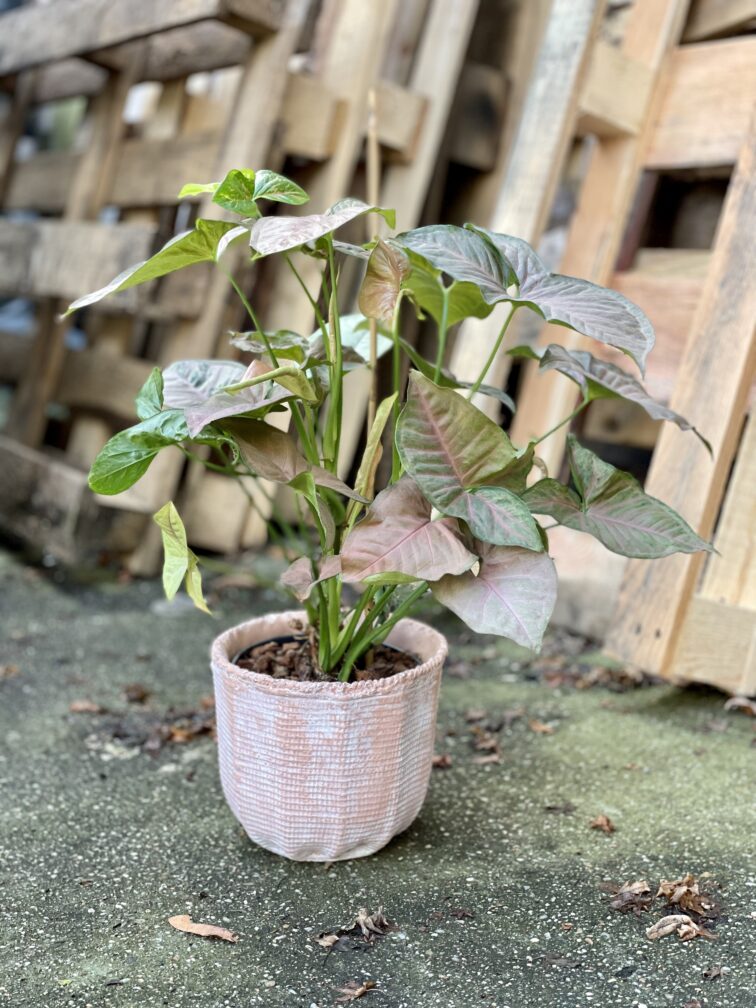 Widoczna na zdjęciu roślina: Syngonium Pink Flecked ma wysokość około 50 cm. Jej doniczka ma 15 cm średnicy oraz 12 cm wysokości.