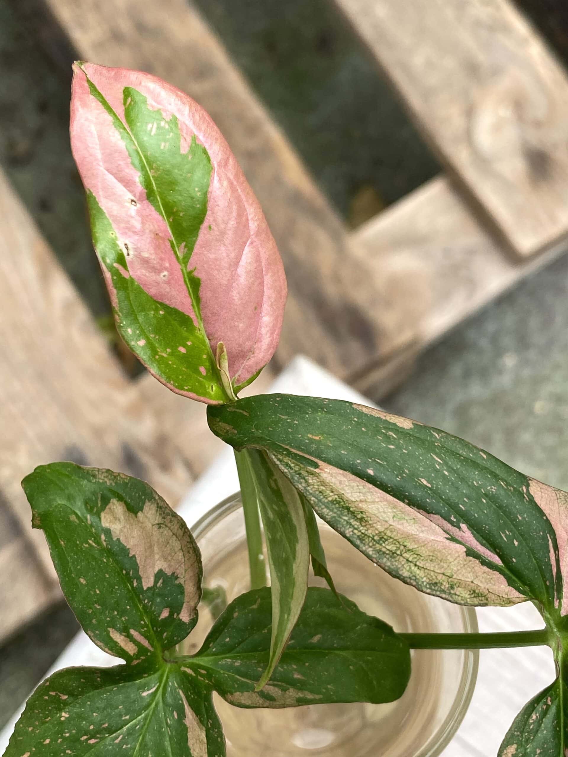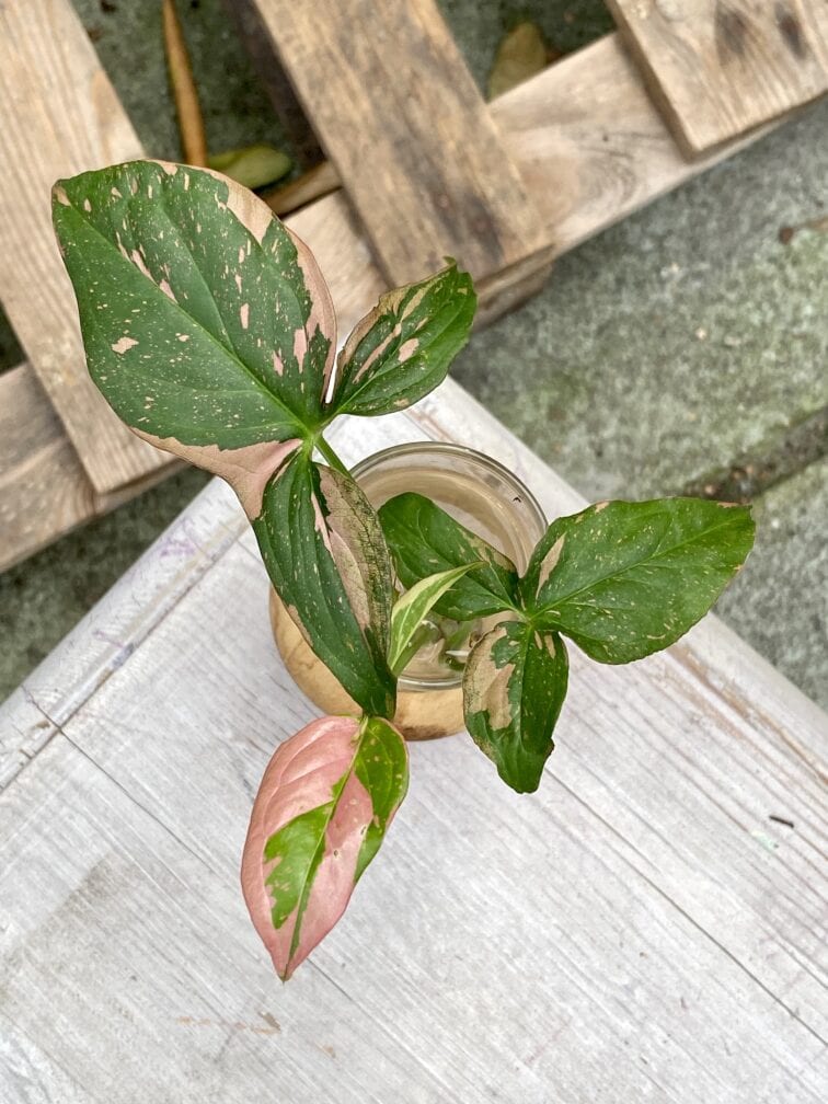 Widoczna na zdjęciu roślina: Syngonium Pink Splash ma wysokość około 10 cm. Jej doniczka ma 1 cm średnicy oraz 1 cm wysokości.