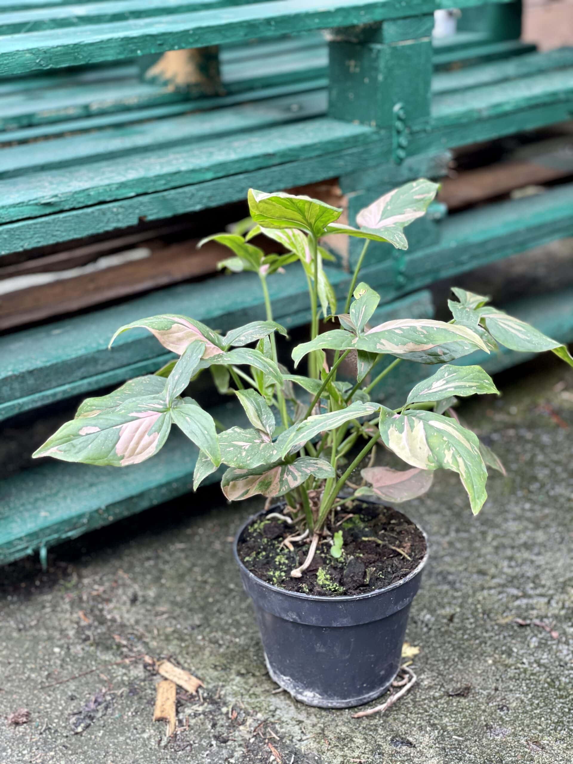 Widoczna na zdjęciu roślina: Syngonium Pink Splash ma wysokość około 35 cm. Jej doniczka ma 15 cm średnicy oraz 13 cm wysokości.