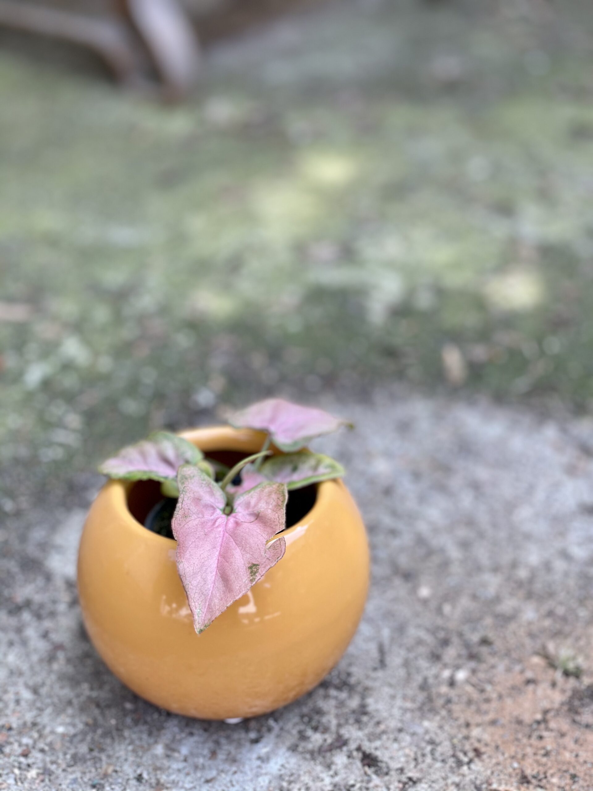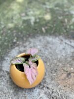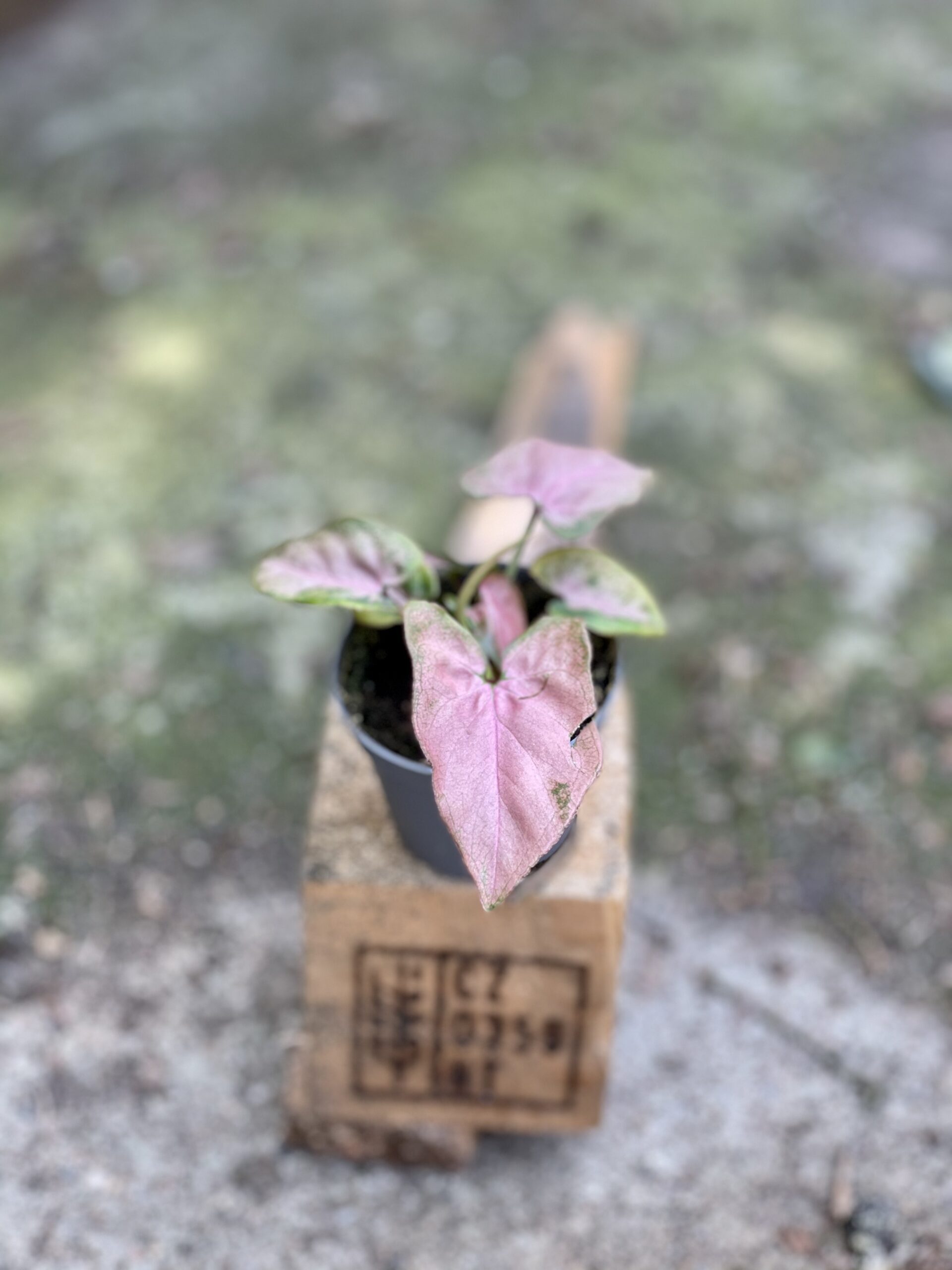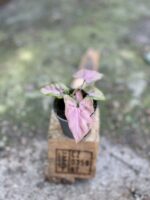 Widoczna na zdjęciu roślina: Syngonium Pink Spot ma wysokość około 10 cm. Jej doniczka ma 5 cm średnicy oraz 5 cm wysokości.