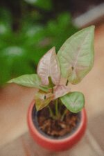 Widoczna na zdjęciu roślina: Syngonium Pink Spot ma wysokość około 11 cm. Jej doniczka ma 5 cm średnicy oraz 5 cm wysokości.