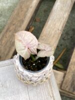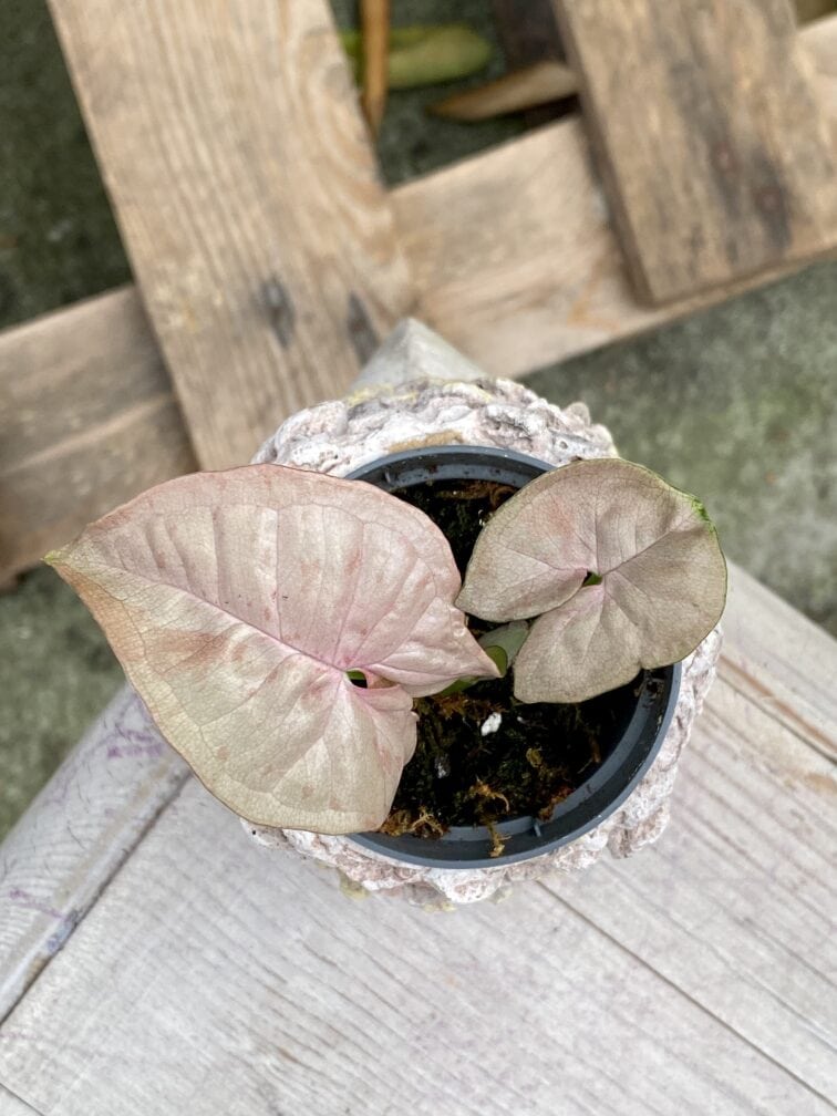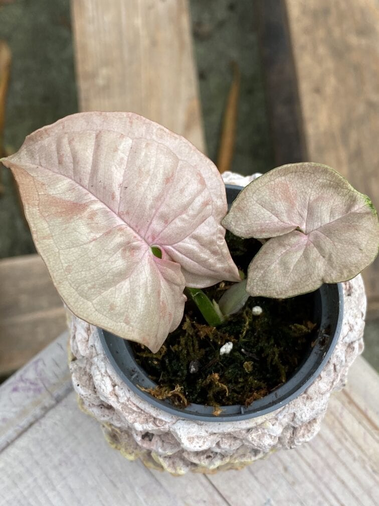 Widoczna na zdjęciu roślina: Syngonium Pink Spot ma wysokość około 9 cm. Jej doniczka ma 5 cm średnicy oraz 5 cm wysokości.