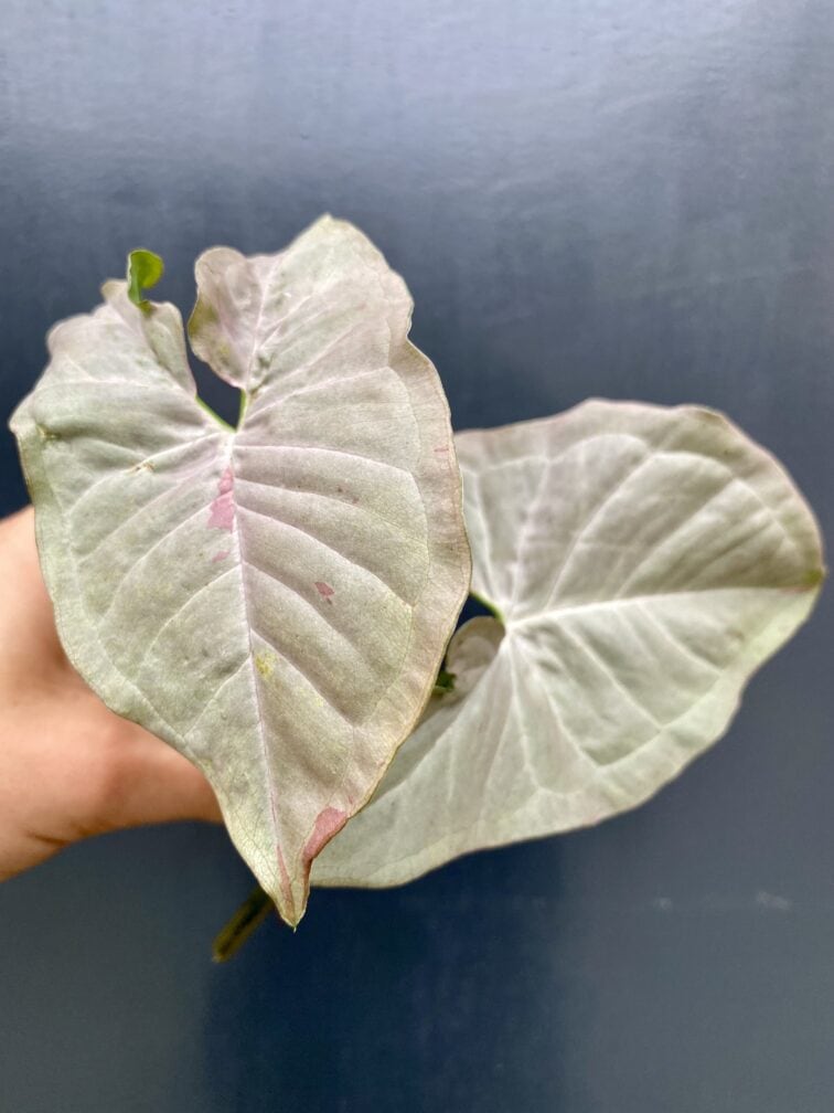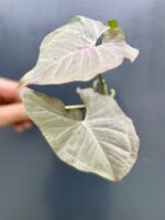 Widoczna na zdjęciu roślina: Syngonium Pink Spot sadzonka ma wysokość około 18 cm. Jej doniczka ma 1 cm średnicy oraz 1 cm wysokości.
