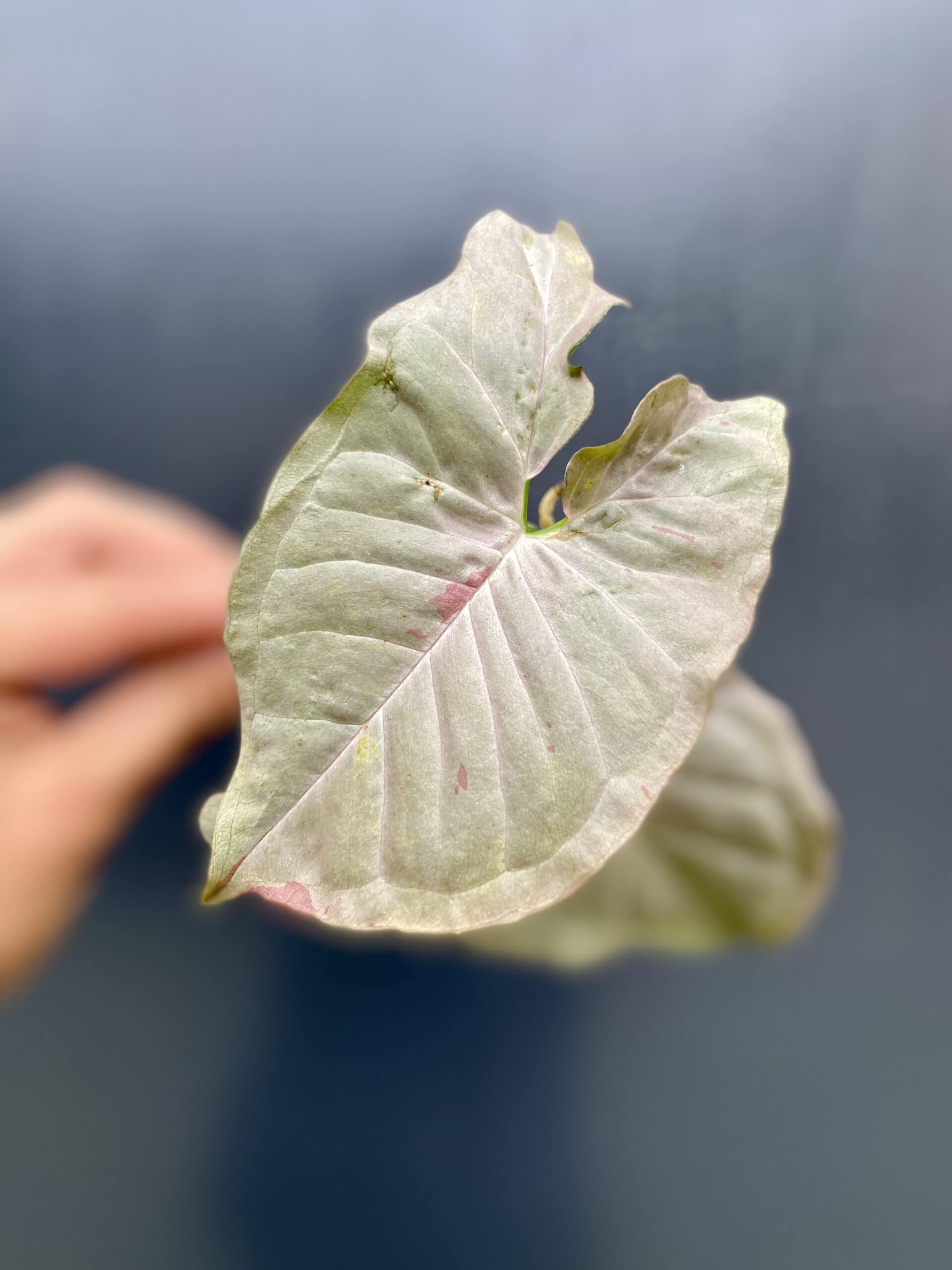 Sadzonka Syngonium Pink Spot, czyli niezwykle uroczej odmiany o liściach nakrapianych pastelowym różem. Sadzonkę polecamy ukorzenić w wodzie z dodatkiem węgla aktywowanego lub w wilgotnym sphagnum. O pielęgnacji już ukorzenionego Syngonium Pink Spot przeczytasz tutaj.