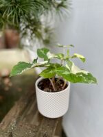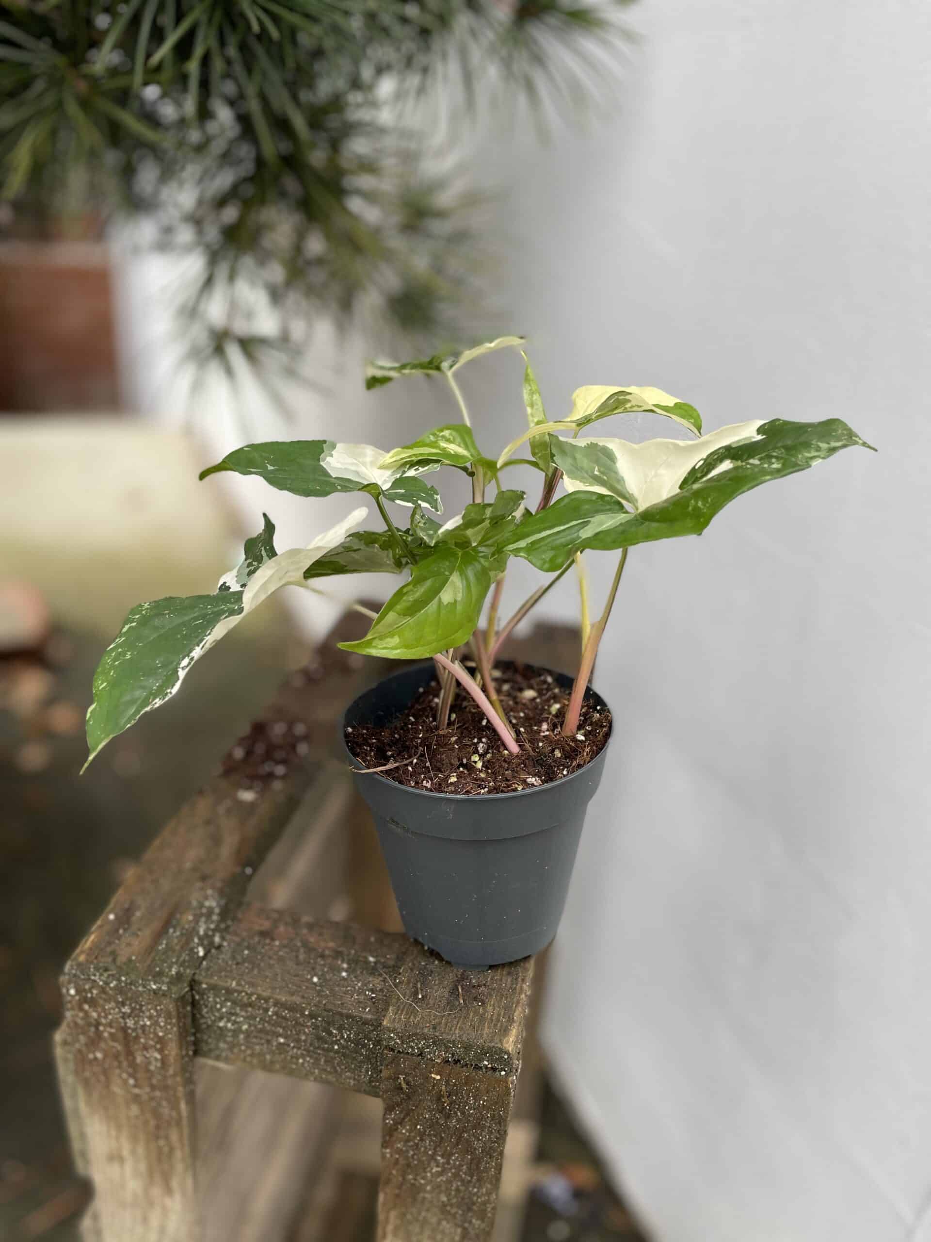 Widoczna na zdjęciu roślina: Syngonium Podophyllum Albo Variegata ma wysokość około 25 cm. Jej doniczka ma 12 cm średnicy oraz 10 cm wysokości.