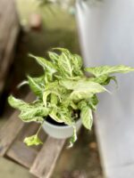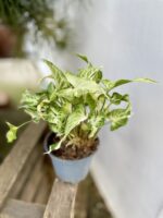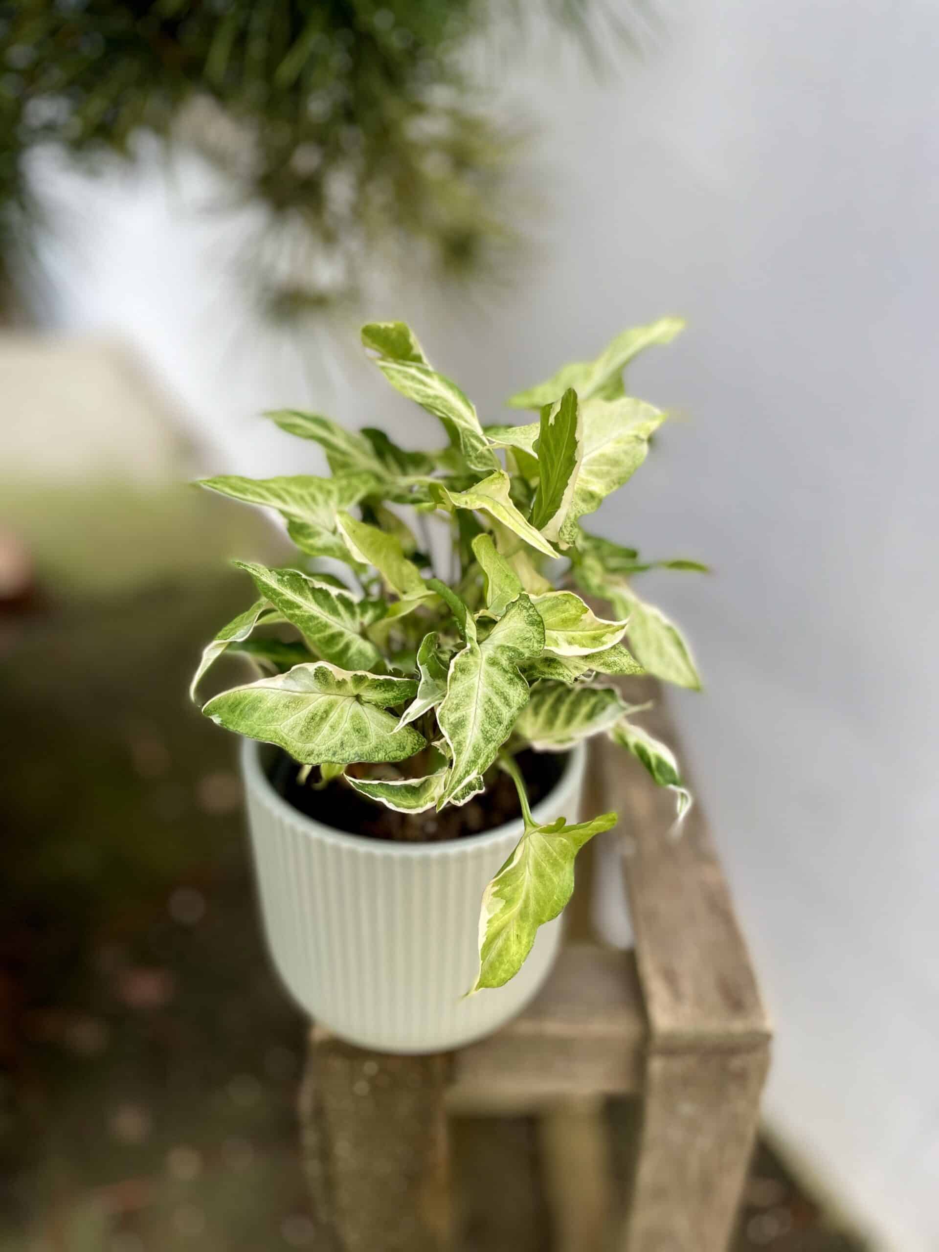 Syngonium Starlite w duecie zieleni i bieli, urzeka strzałkowatymi liśćmi o nieregularnych, karbowanych brzegach. Roślina ma dzięki nim piękną, dynamiczną formę, którą wizualnie wzmacnia jeszcze gęsty, ekspresyjny pokrój.