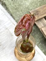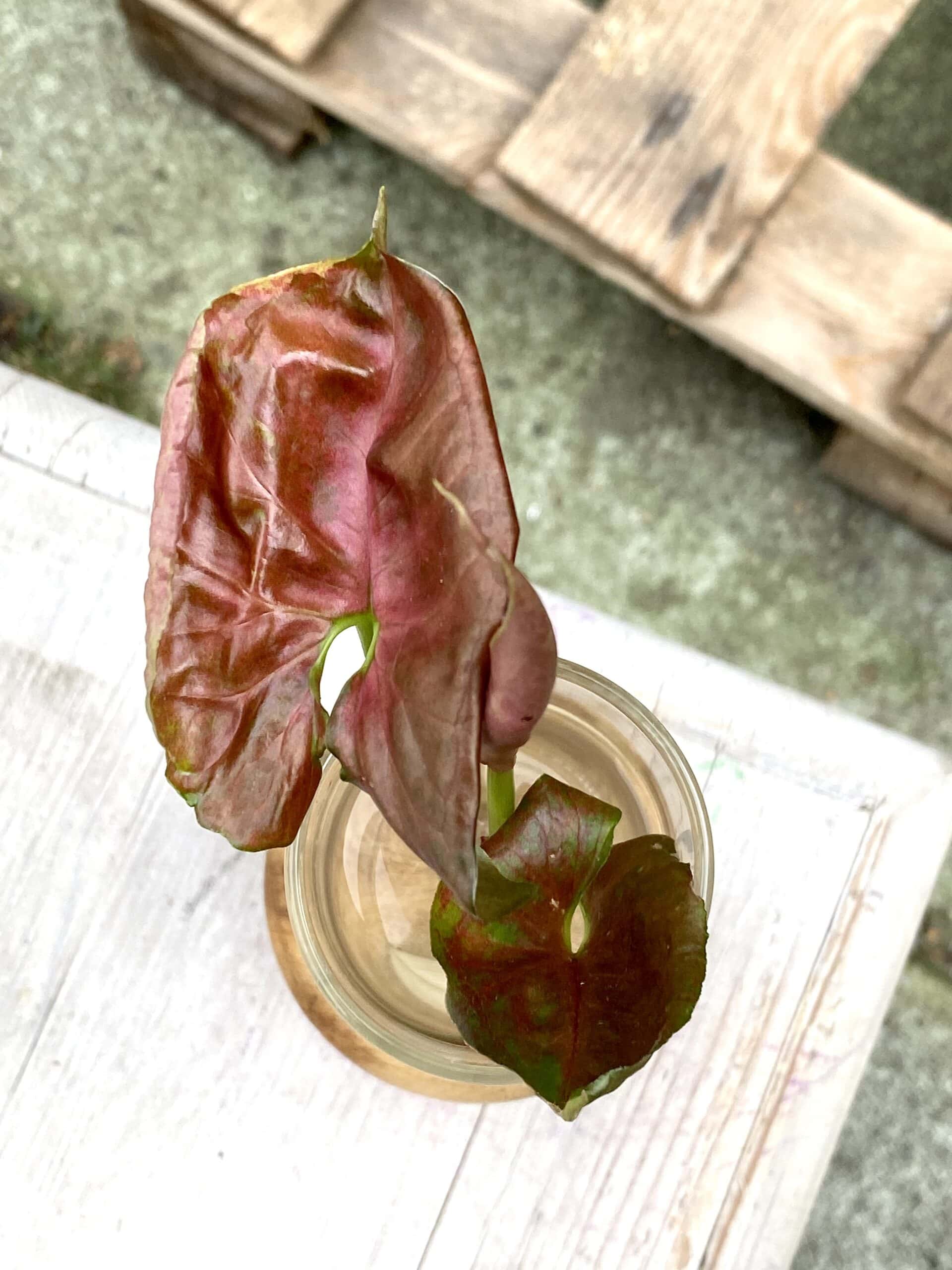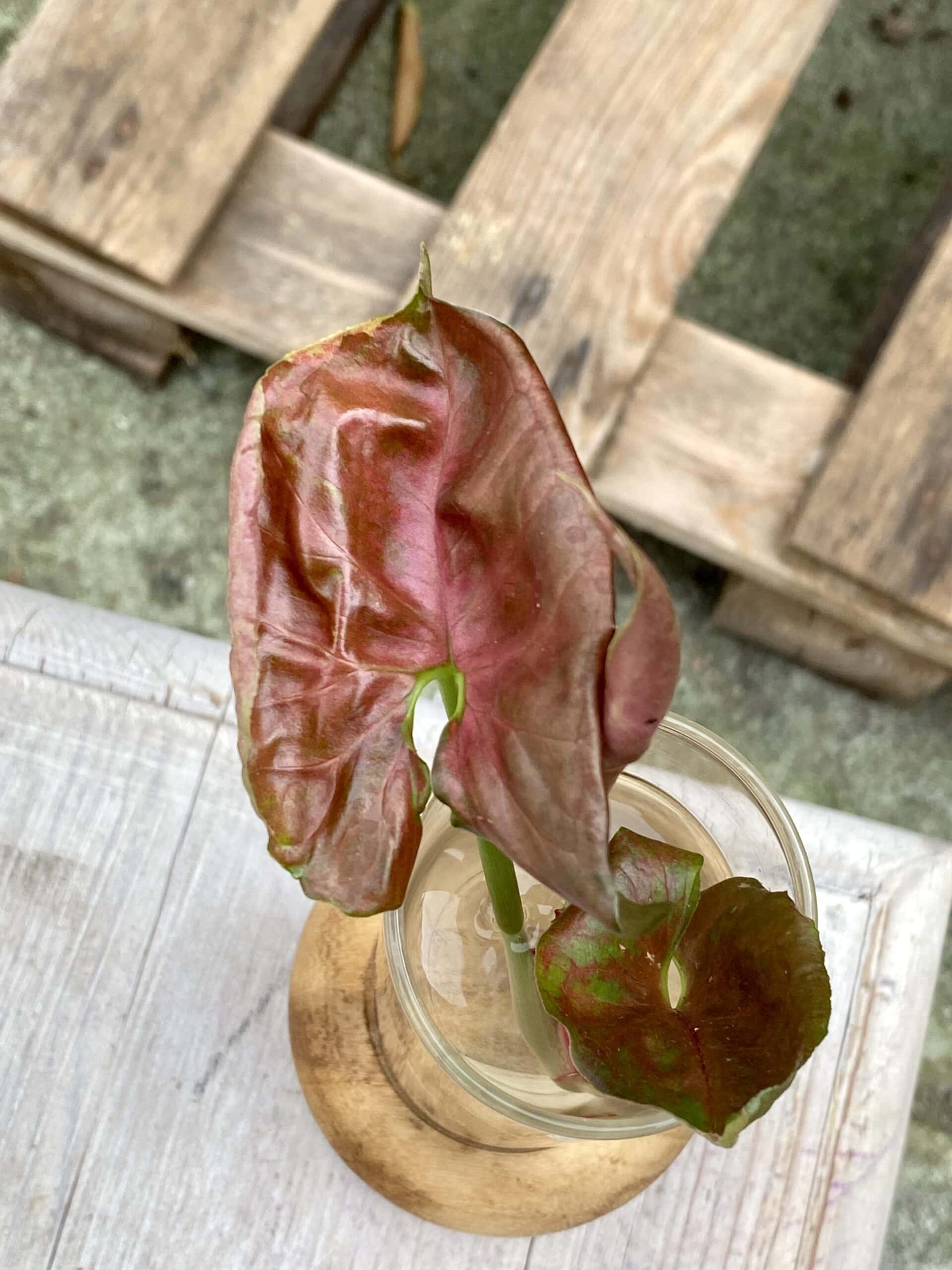 Syngonium Strawberry Ice, czyli kolekcjonerska, truskawkowa zroślicha. Ciemne liście w kolorze melasy zyskują na uroku, gdy pojawiają się na nich intensywnie różowe fragmenty. Prawdziwa gratka dla miłośników syngonium, do tego szybko rosnąca!