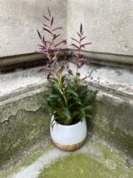 Dekoracyjna roślina o purpurowych kwiatostanach i ozdobnie pofalowanych, wstęgowatych liściach.
