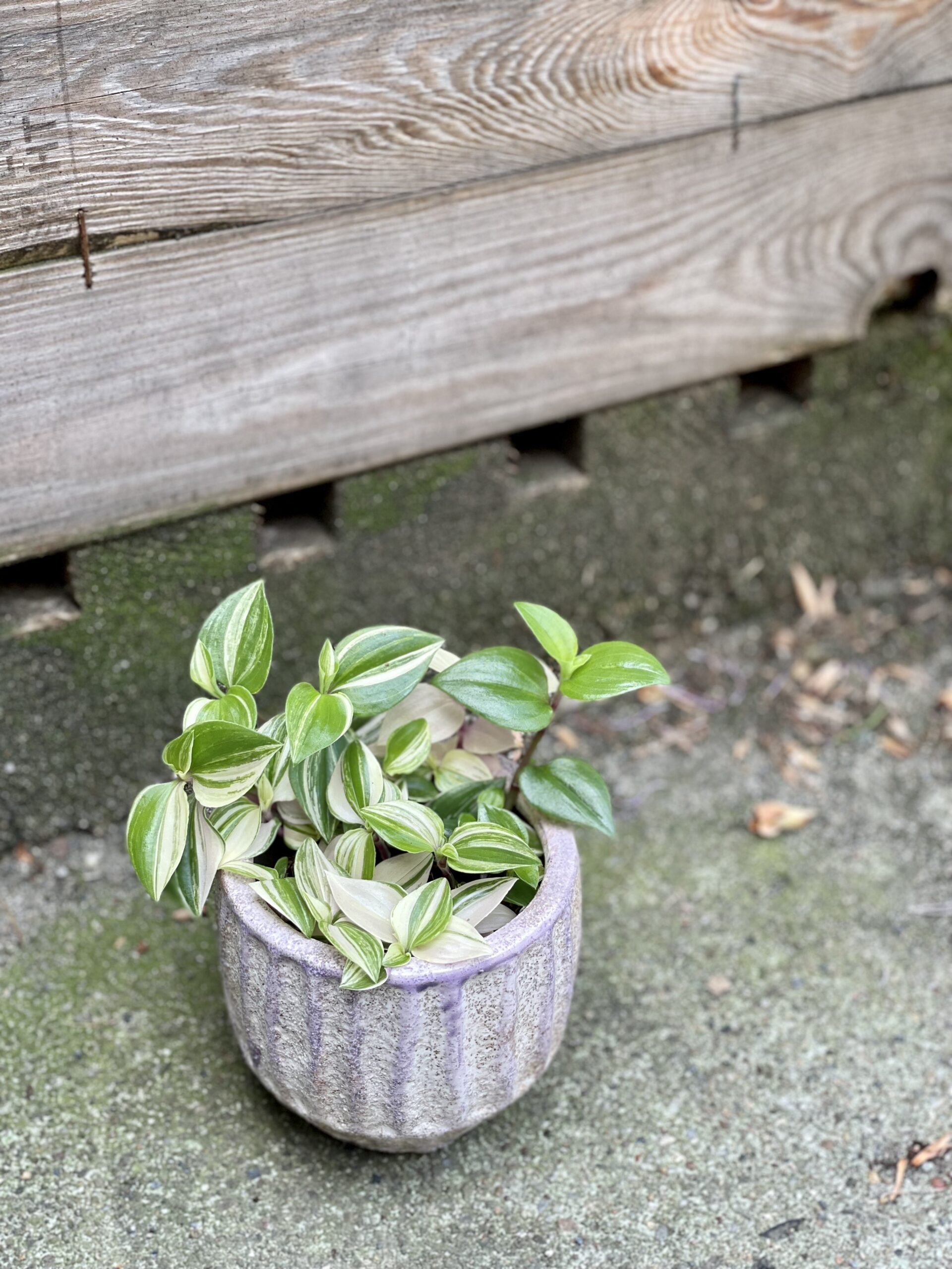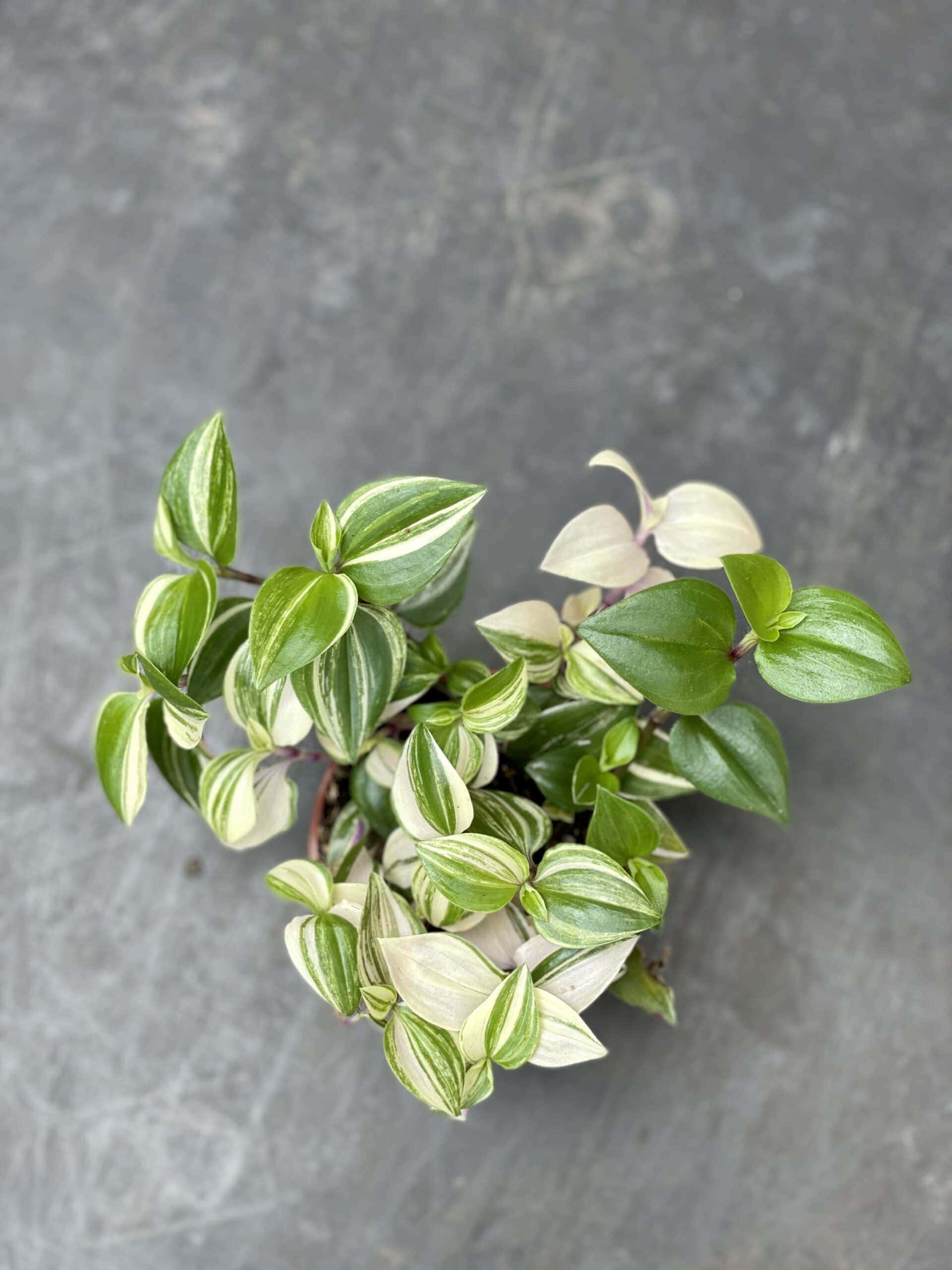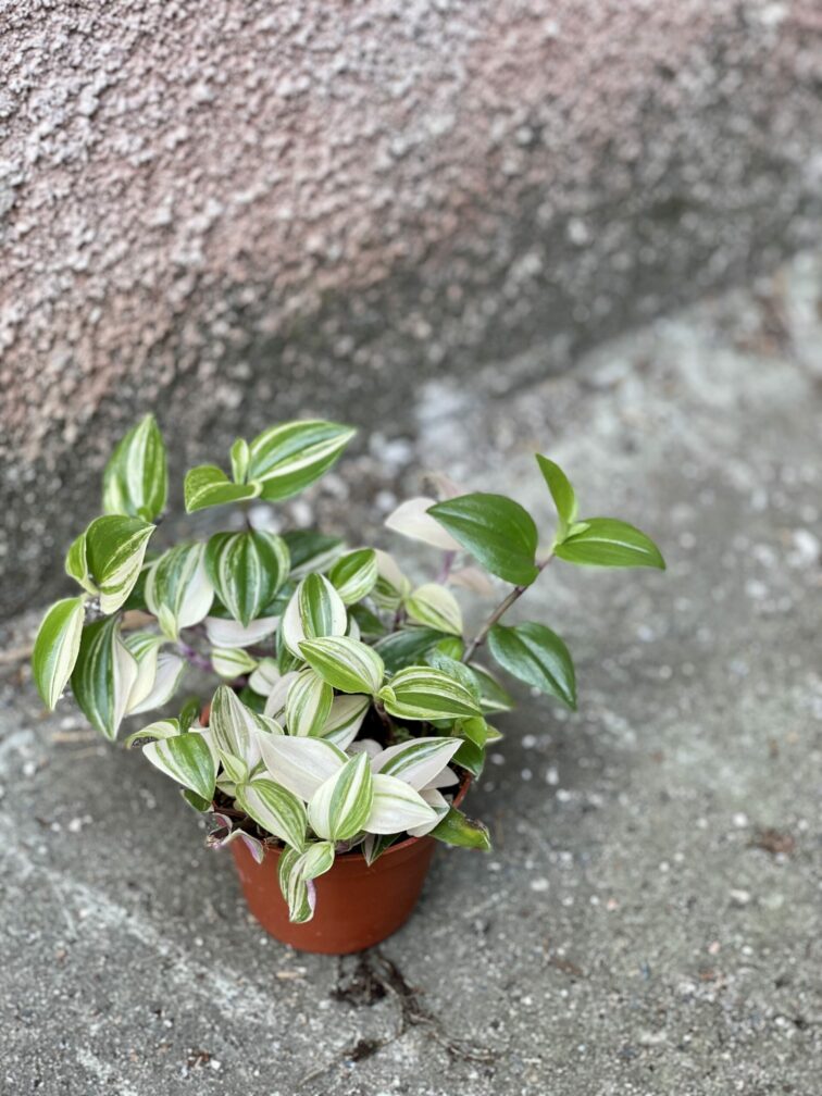 Widoczna na zdjęciu roślina: Tradescantia fluminensis quadricolor ma wysokość około 15 cm. Jej doniczka ma 8 cm średnicy oraz 7 cm wysokości.