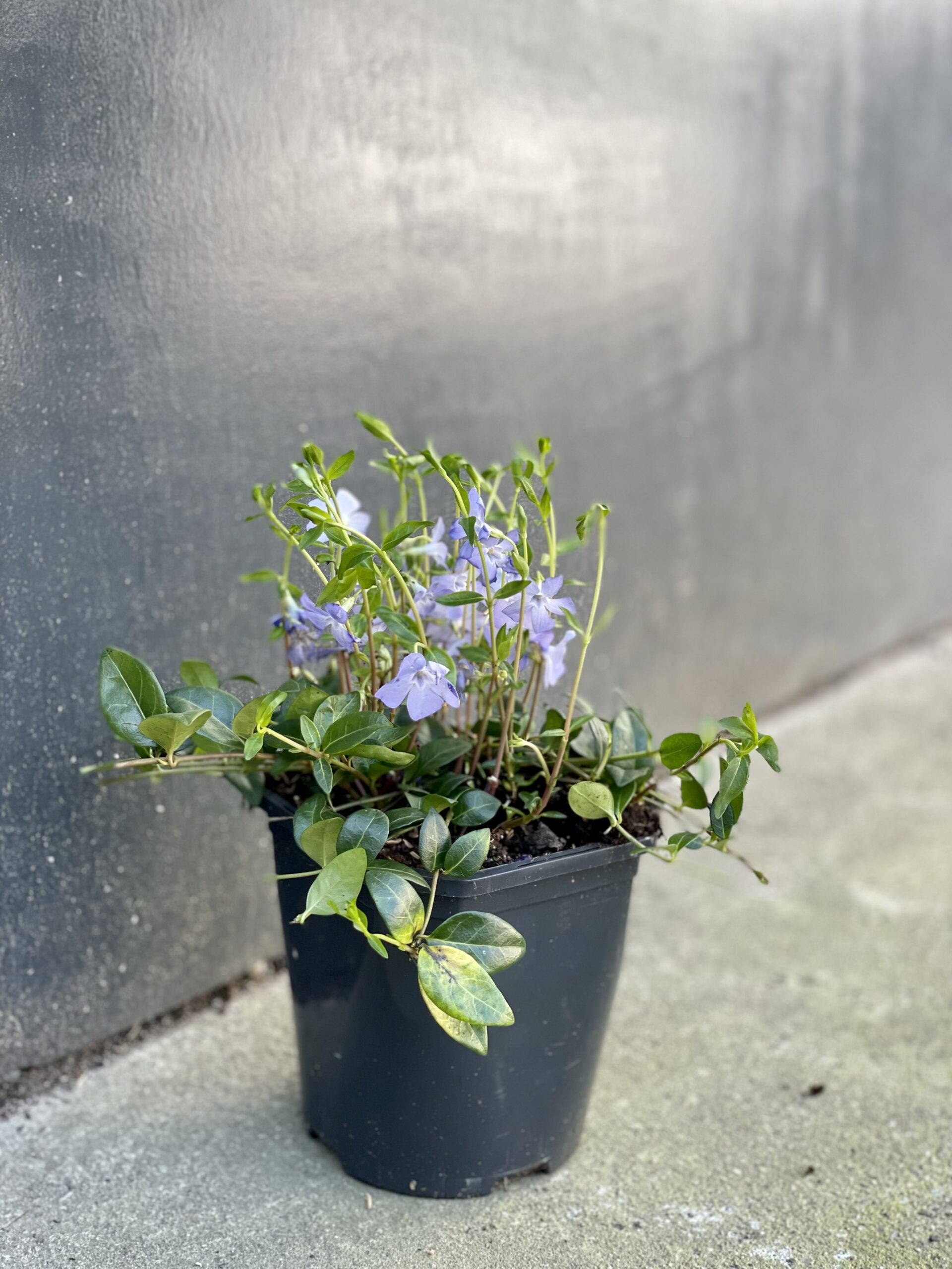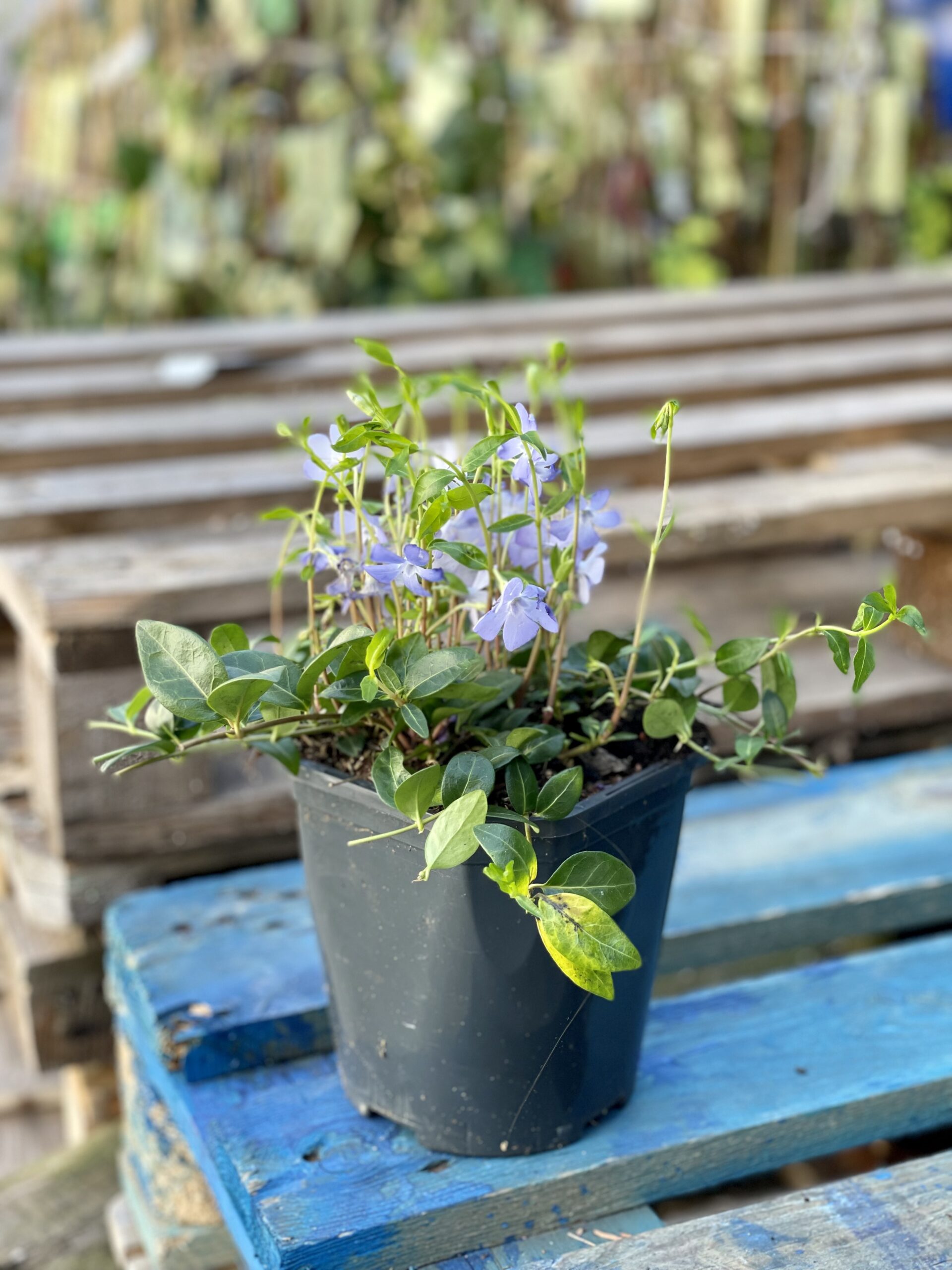 Widoczna na zdjęciu roślina: Vinca Minor ma wysokość około 30 cm. Jej doniczka ma 15 cm średnicy oraz 15 cm wysokości.