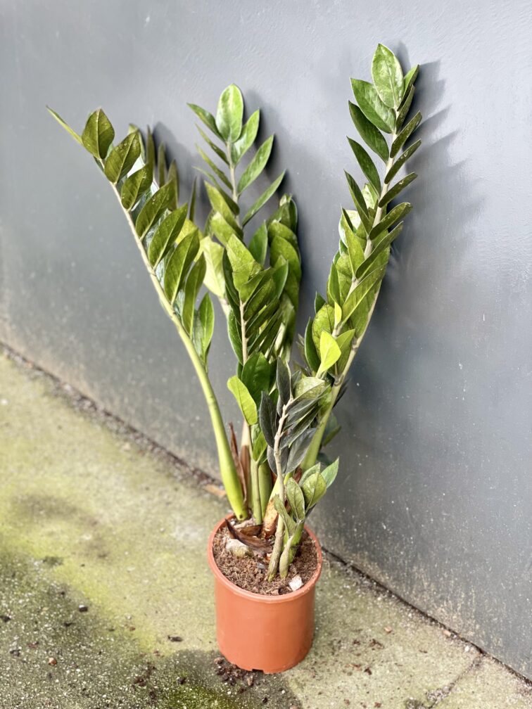 Widoczna na zdjęciu roślina: Zamioculcas Supernova ma wysokość około 60 cm. Jej doniczka ma 17 cm średnicy oraz 15 cm wysokości.